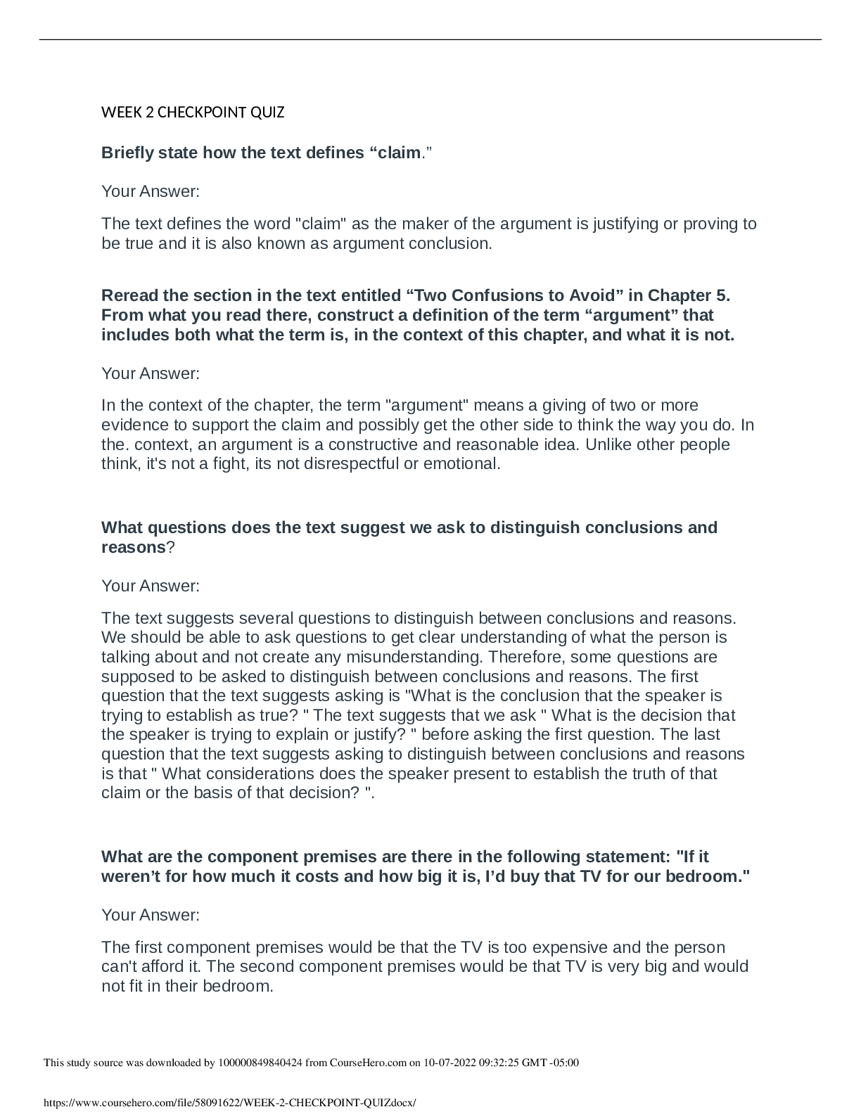 Philosophy > QUESTIONS & ANSWERS > PHI208 Week 2 Quiz Already Graded A (All)