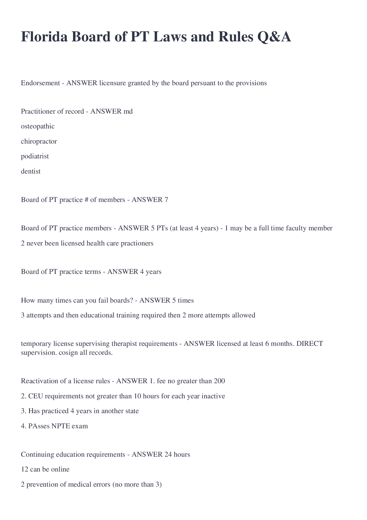 Philosophy > EXAM > Florida Board of PT Laws and Rules Q & A (All)
