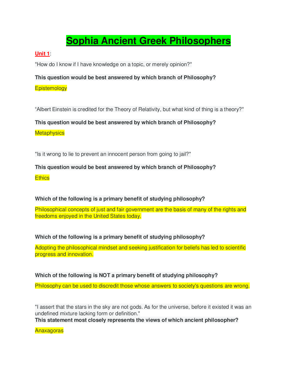 Philosophy > SOPHIA Milestone > Sophia ANCIENT GREEK PHILOSOPHERS MILESTONE 1, Questions with Complete Answers (All)