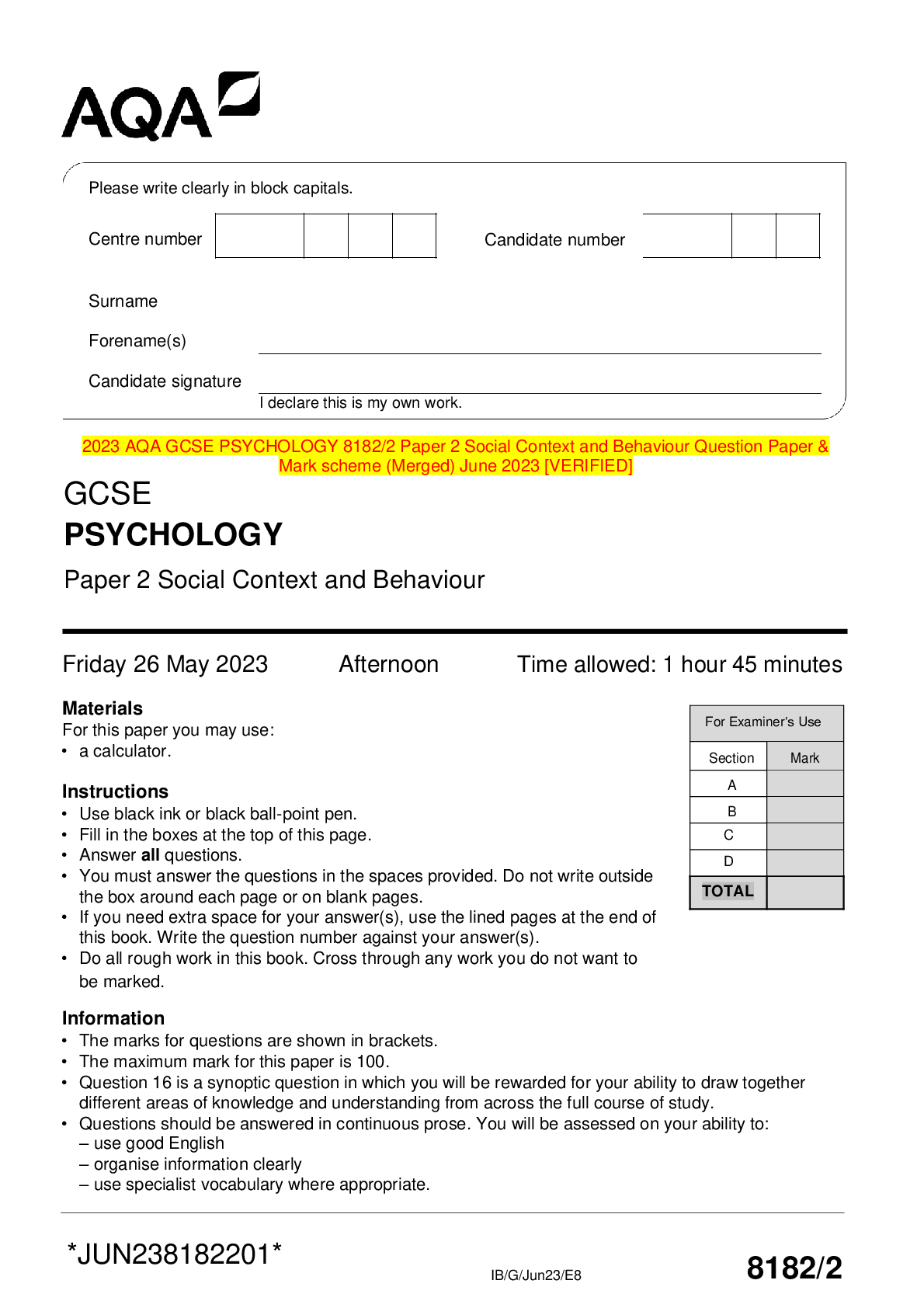 AQA > AQA QUESTION and MARK SCHEMES > 2023 AQA GCSE PSYCHOLOGY 8182/2 Paper 2 Social Context and Behaviour Question Paper & Mark scheme (Merged) June 2023 [VERIFIED] (All)