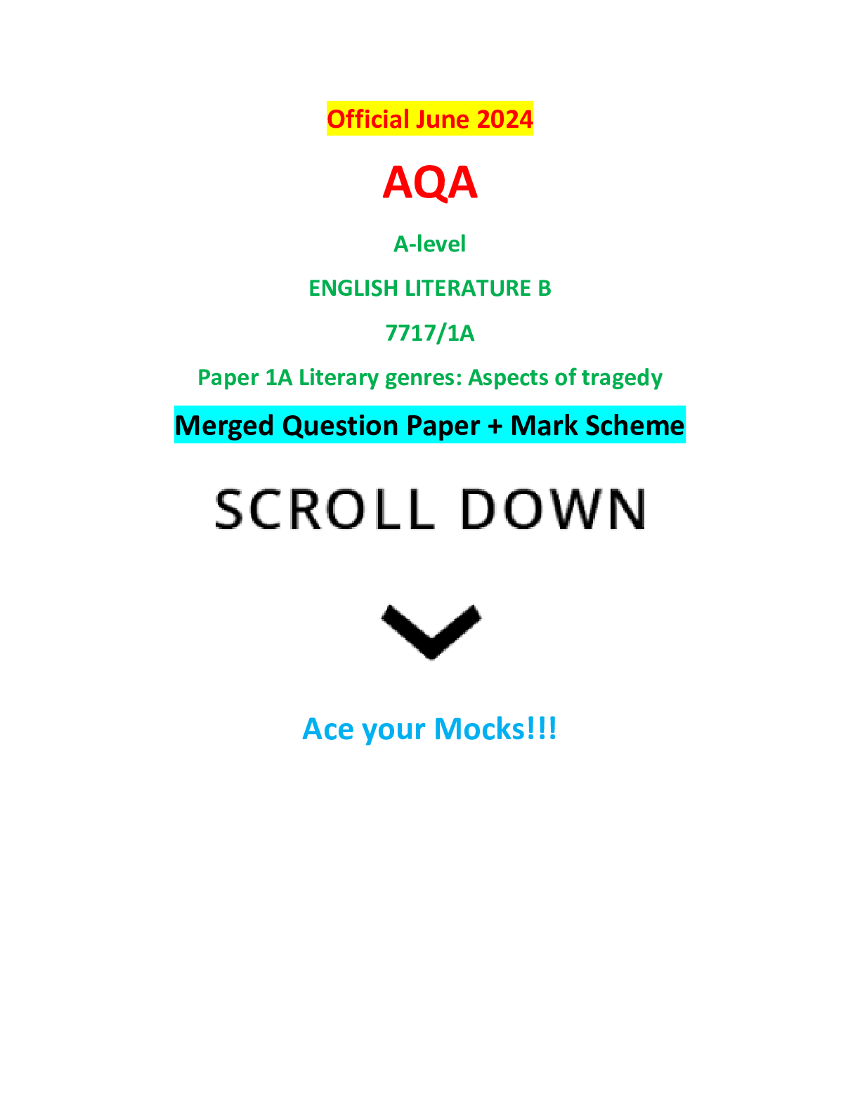 AQA > AQA > Official June 2024 AQA A-level ENGLISH LITERATURE B 7717/1A Paper 1A Literary genres: Aspects of tragedy Merged Question Paper + Mark Scheme (All)