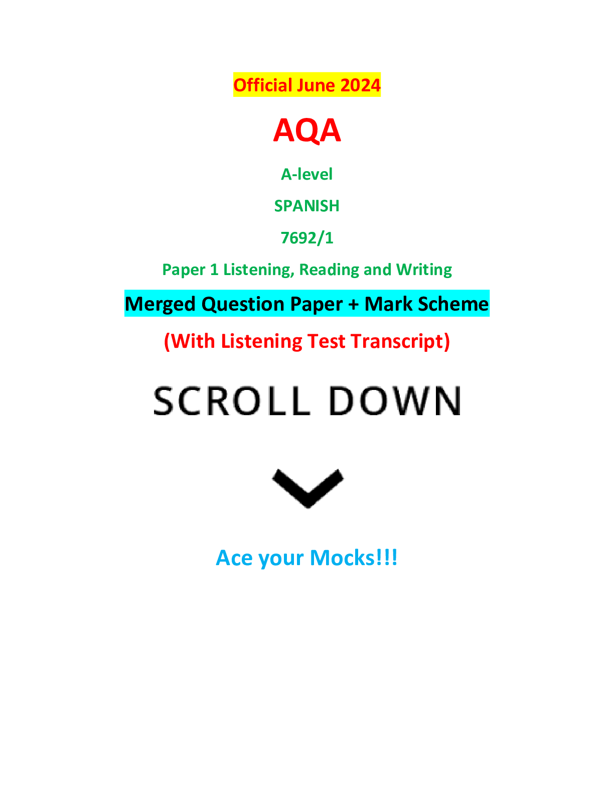 AQA > AQA > Official June 2024 AQA A-level SPANISH 7692/1 Paper 1 Listening, Reading and Writing Merged Question Paper + Mark Scheme (All)