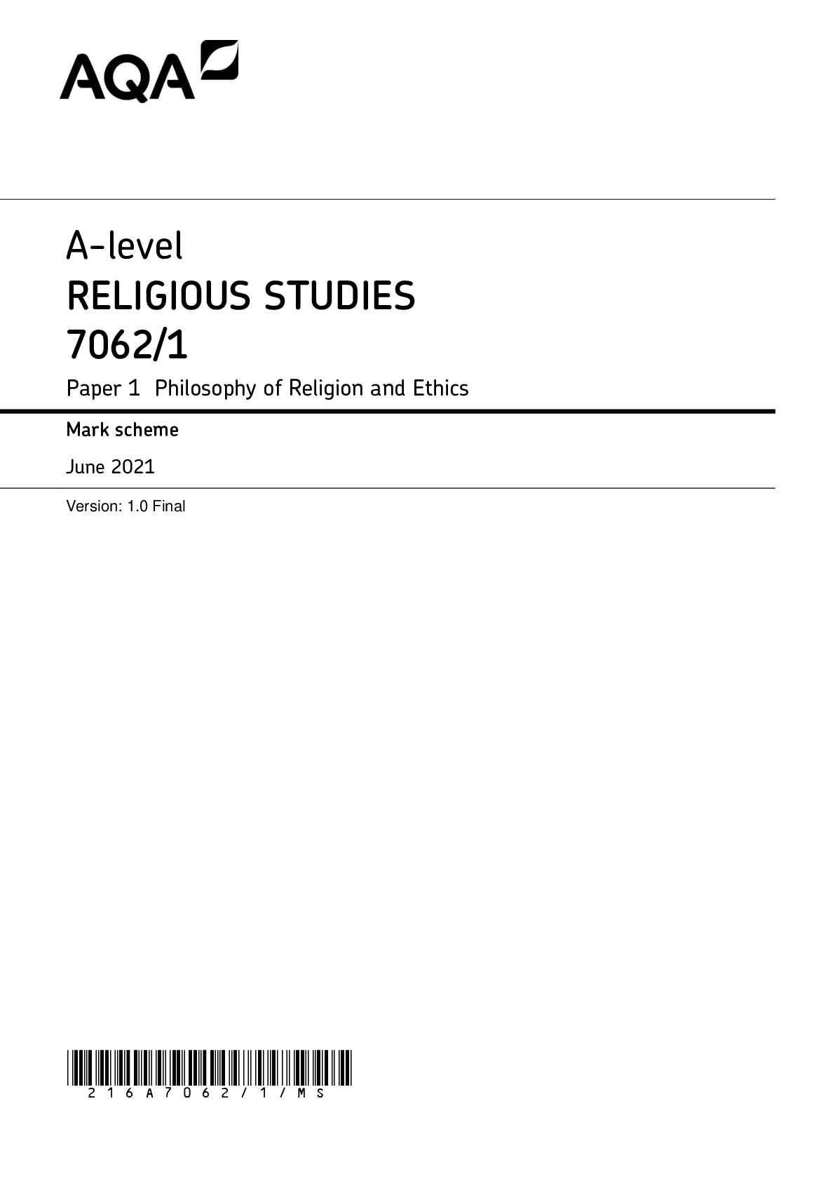 Religious Studies > AQA QUESTION and MARK SCHEMES > AQA A-level RELIGIOUS STUDIES 7062/1 Paper 1 Philosophy of Religion and Ethics Mark scheme June 2021 Version: 1.0 Fina (All)