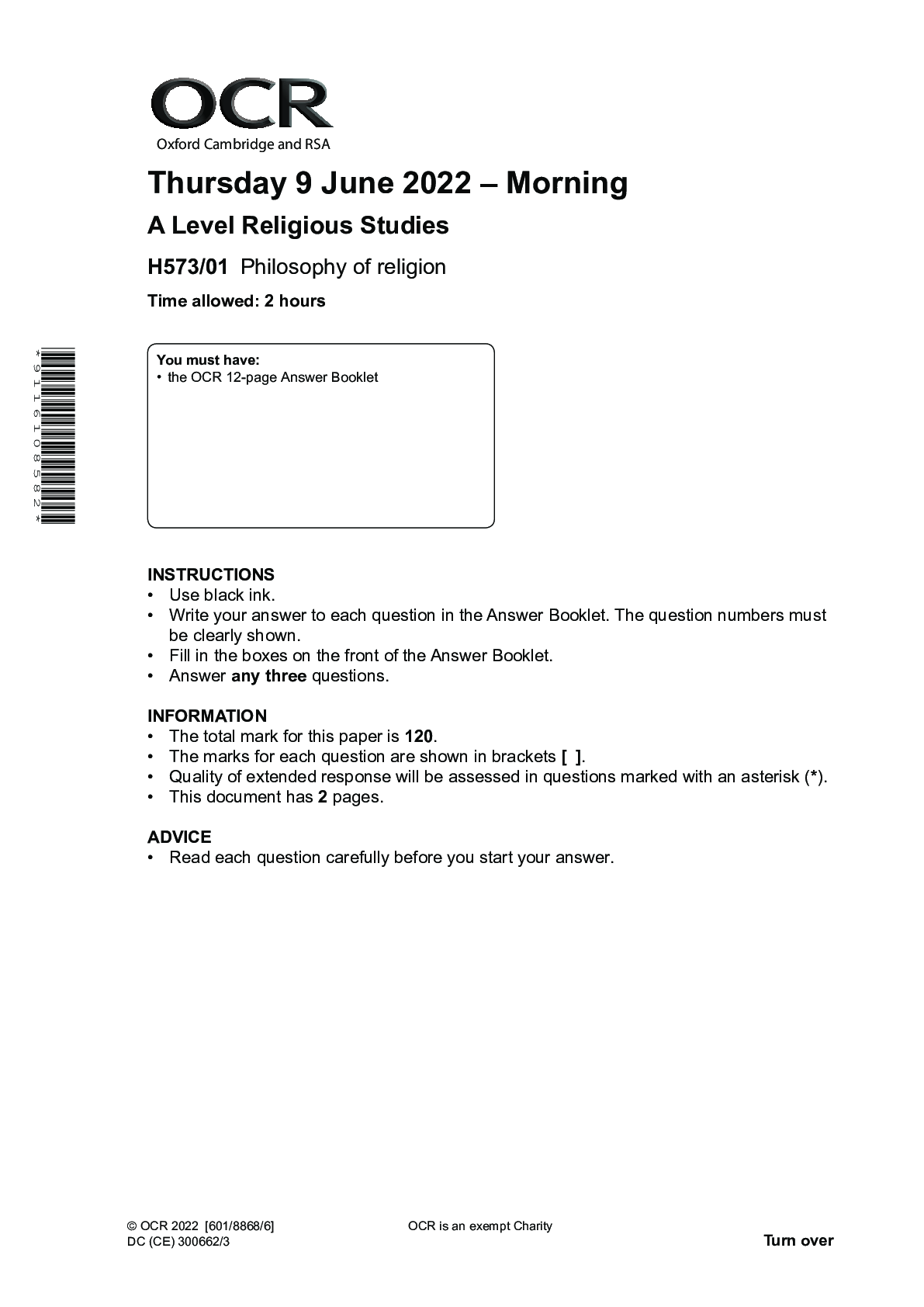 Religious Studies > Edexcel Question Paper > OCR A Level Religious Studies H573/01 Philosophy of religion QUESTION PAPER Thursday 9 June 2022 – Morning (All)
