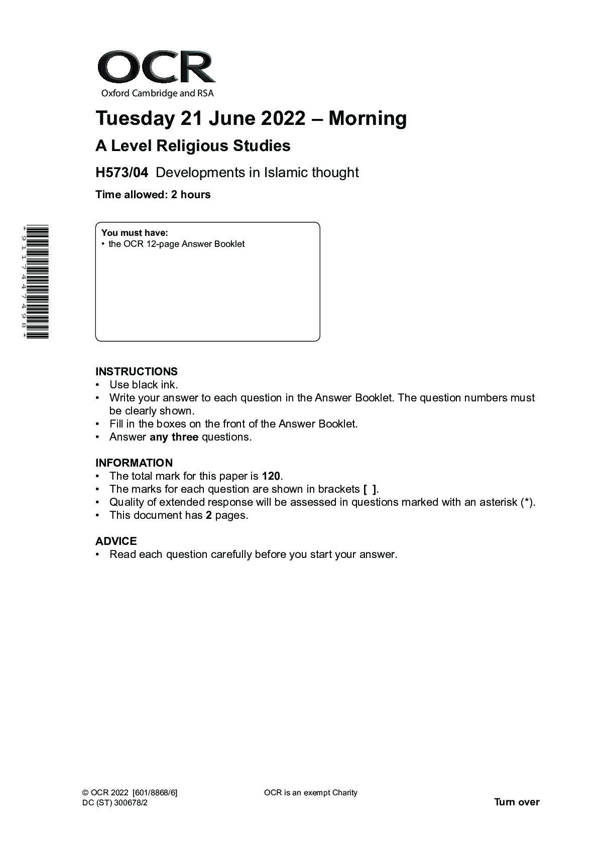 Religious Studies > Edexcel Question Paper > OCR A Level Religious Studies H573/04 Developments in Islamic thought QUESTION PAPER Tuesday 21 June 2022 – Morning (All)