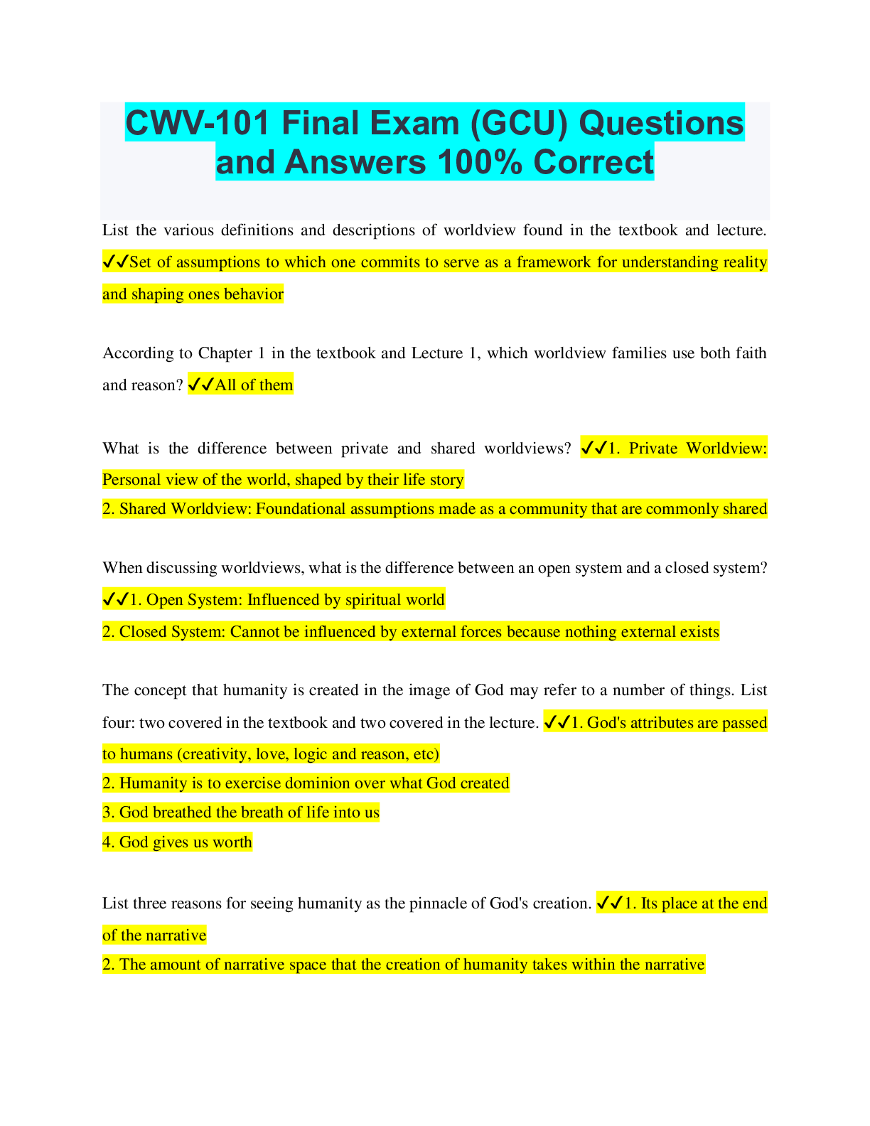 Religious Studies > QUESTIONS & ANSWERS > CWV-101 Final Exam (GCU) Questions and Answers 100% Correct (All)