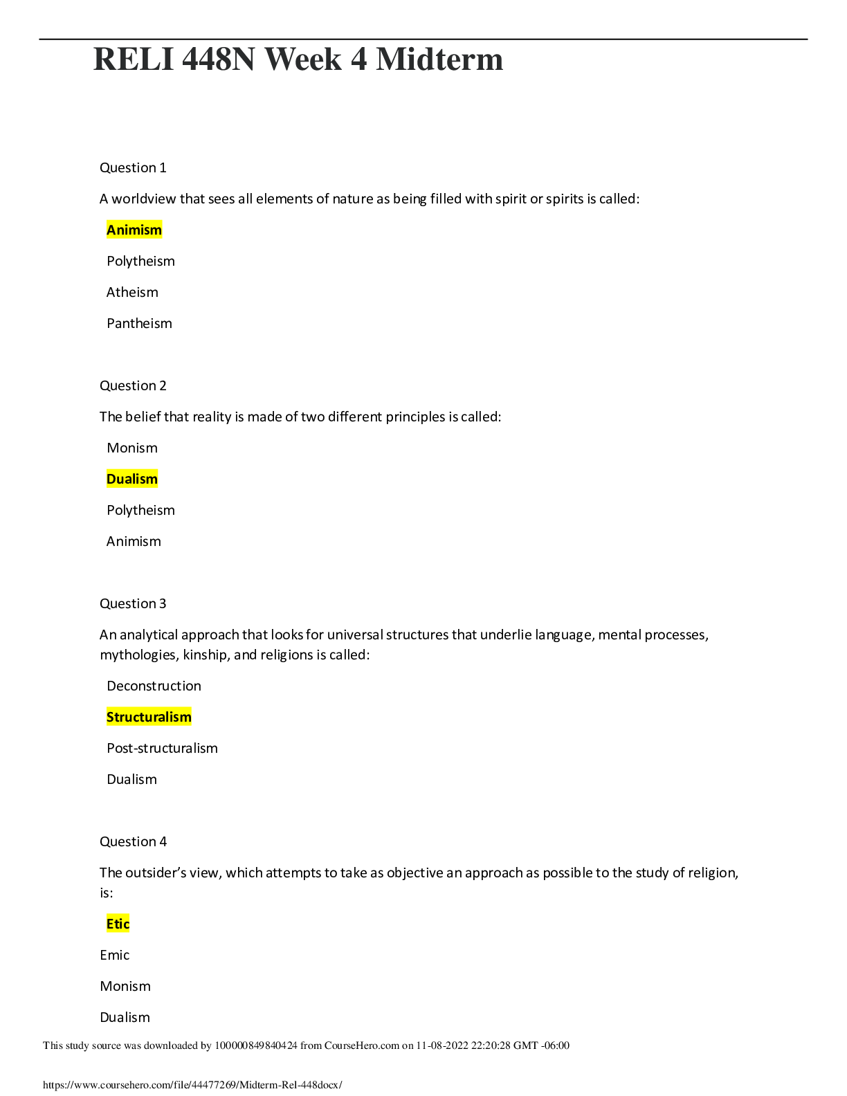 Religious Studies > EXAM > RELI 448N Week 4 Midterm (100 out of 100) Questions and Answer solutions | Download To Score An A (All)