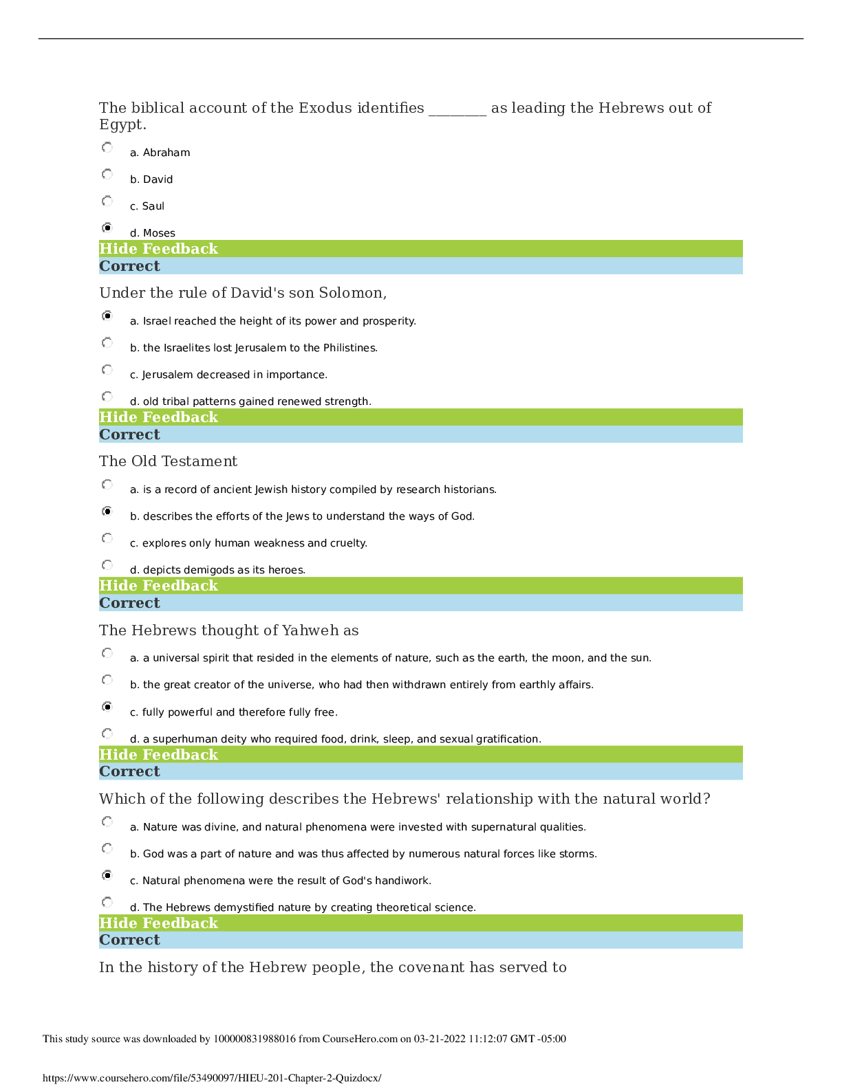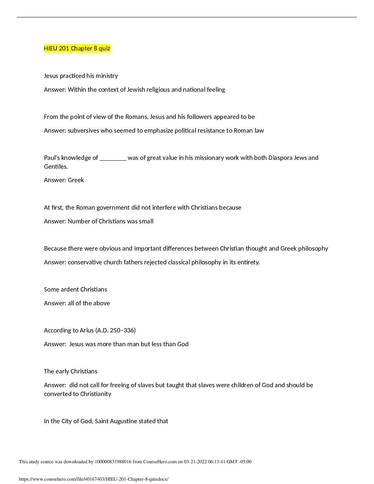 Religious Studies > QUESTIONS & ANSWERS > [SOLVED] HIEU 201 / HIEU201 Chapter 2 Quiz (LATEST 2022) (All)