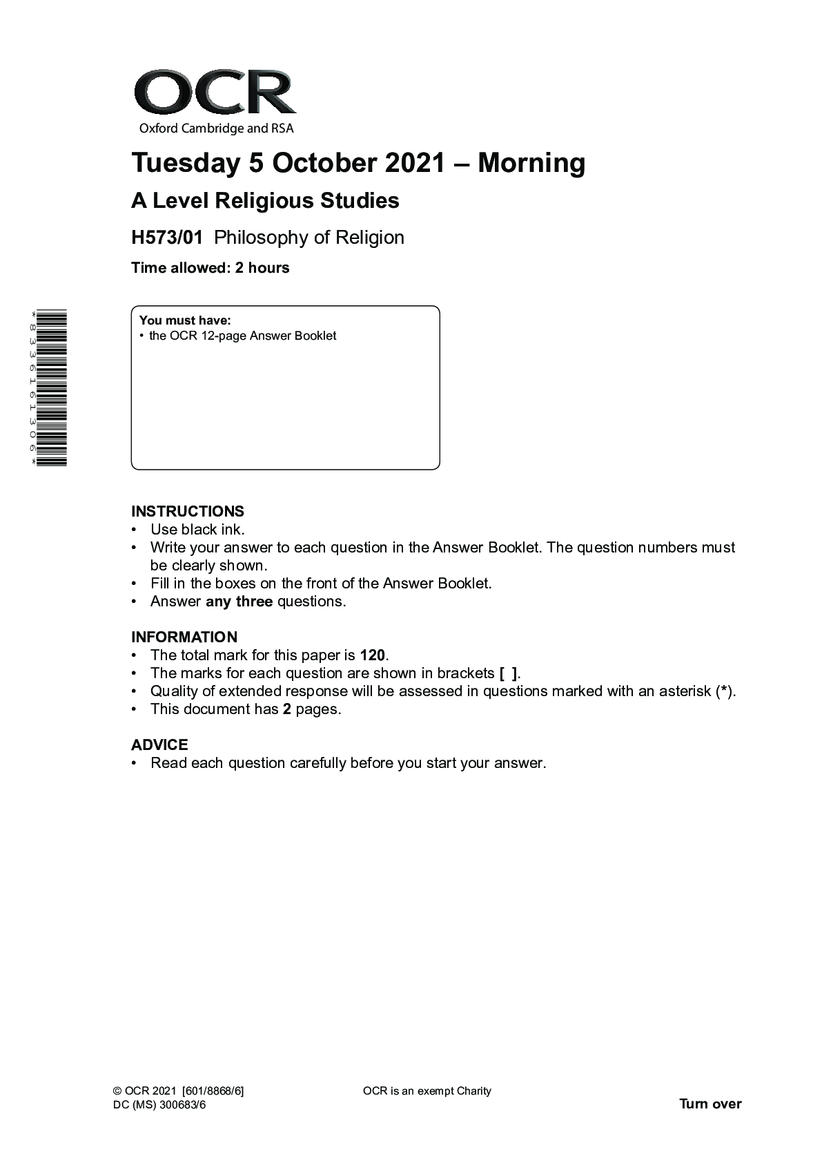 Religious Studies > Higher Education > A Level Religious Studies_H573/01 Question Paper Oct 2021 | Philosophy of Religion (All)