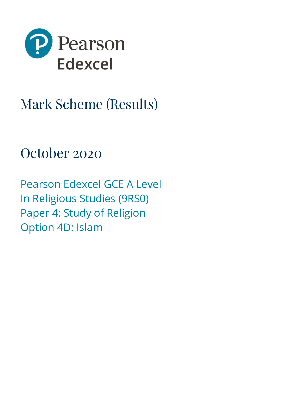 Religious Studies > Edexcel > Pearson Edexcel_Religious Studies_9RS0/4D Mark Scheme_2020 | Study of Religion Option 4D: Islam (All)
