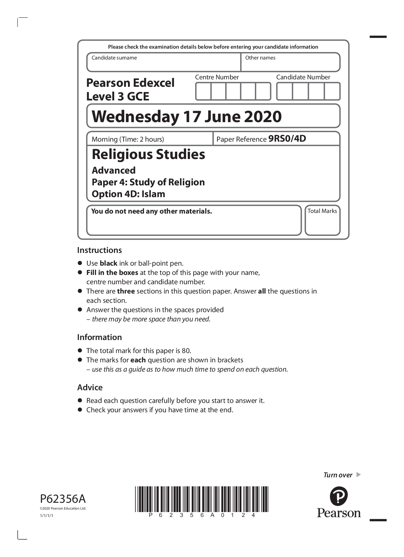 Religious Studies > Edexcel Question Paper > Pearson Edexcel_Religious Studies_9RS0/4D Question Paper_2020 | Study of Religion Option 4D: Islam (All)
