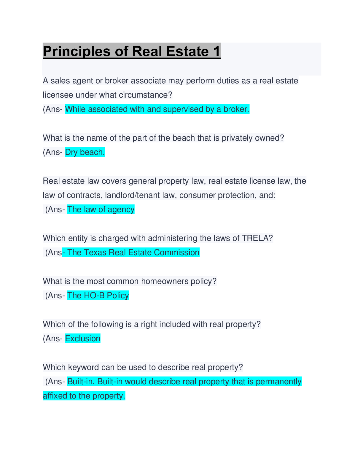 Urban Policy and Planning > EXAM > Principles of Real Estate 1 : Questions & Answers: Updated A+ Score Guide (All)