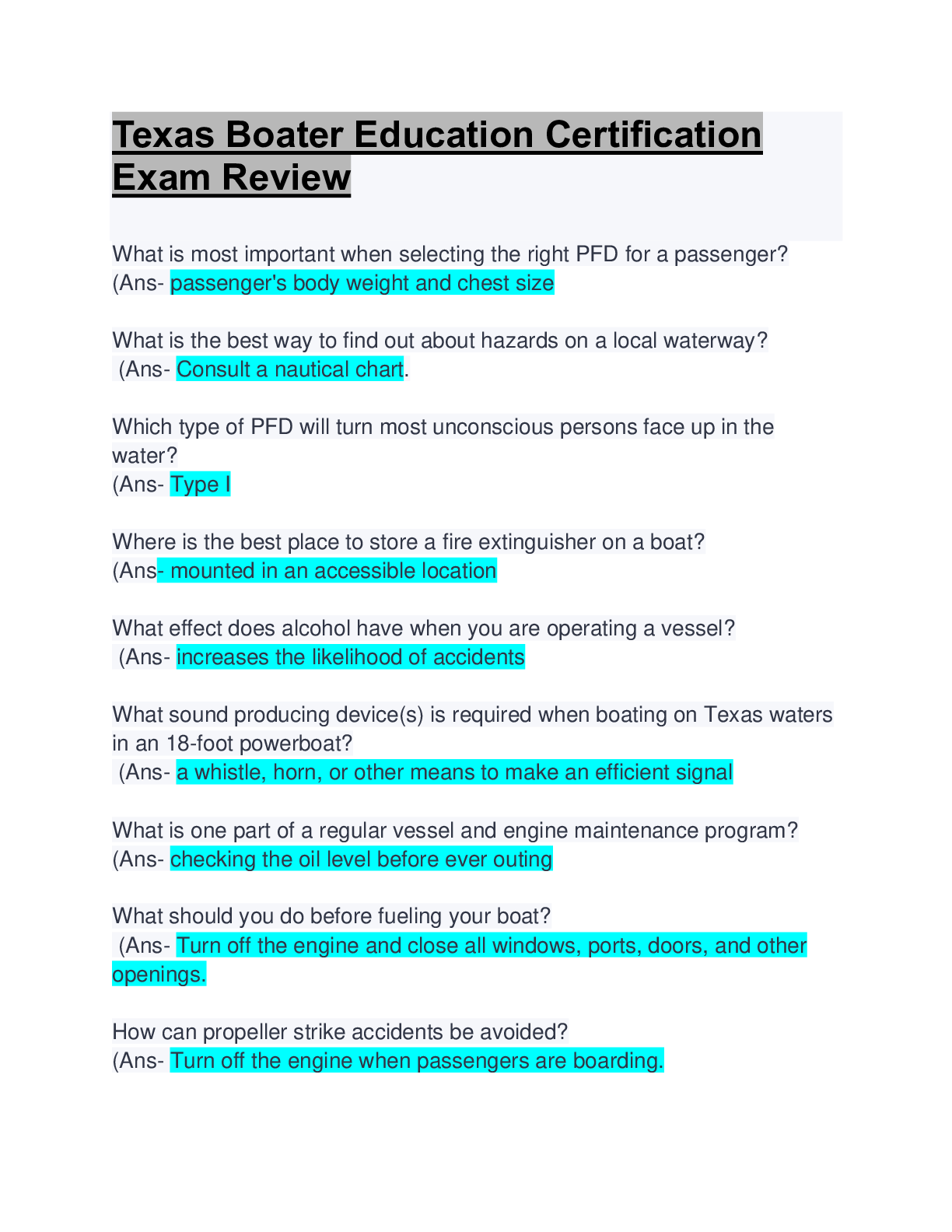 Urban Policy and Planning > EXAM REVIEW > Texas Boater Education Certification Exam Review: Texas Boater Education Certification Exam; Questions & Answers: Updated (All)