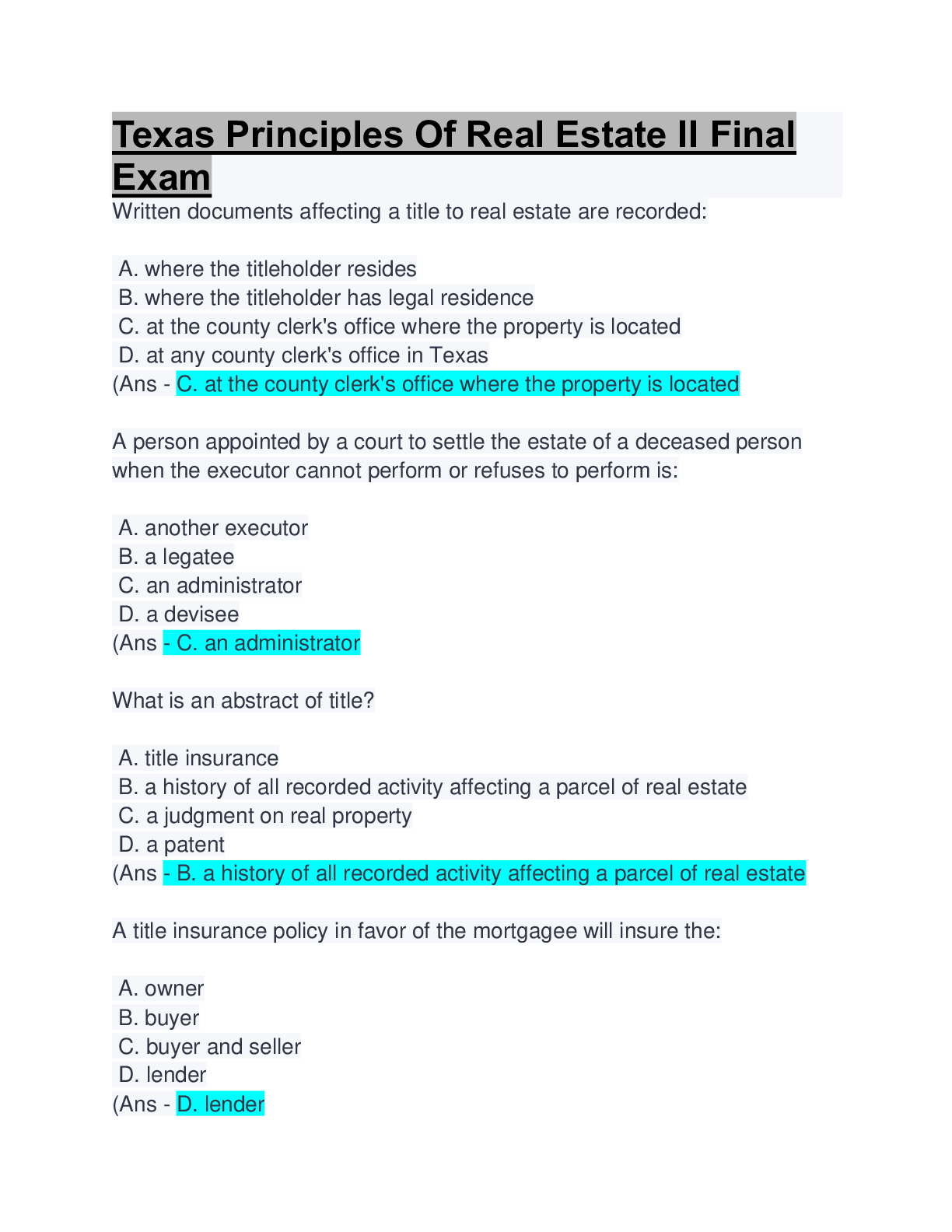 Urban Policy and Planning > EXAM > Texas Principles Of Real Estate II Final Exam: Questions & Answers: Latest Updated (All)