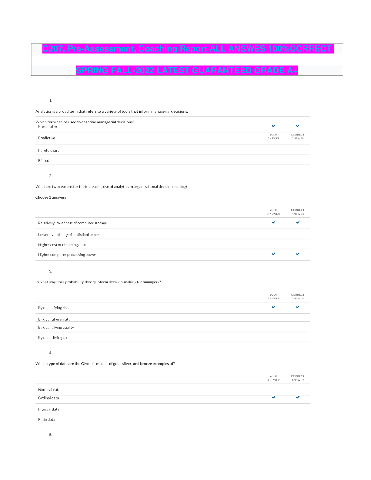 Management > QUESTIONS and ANSWERS > C207, Pre-Assessment, Coaching Report ALL ANSWES 100%CORRECT SPRING FALL-2022 LATEST GUARANTEED GRADE A+ (All)