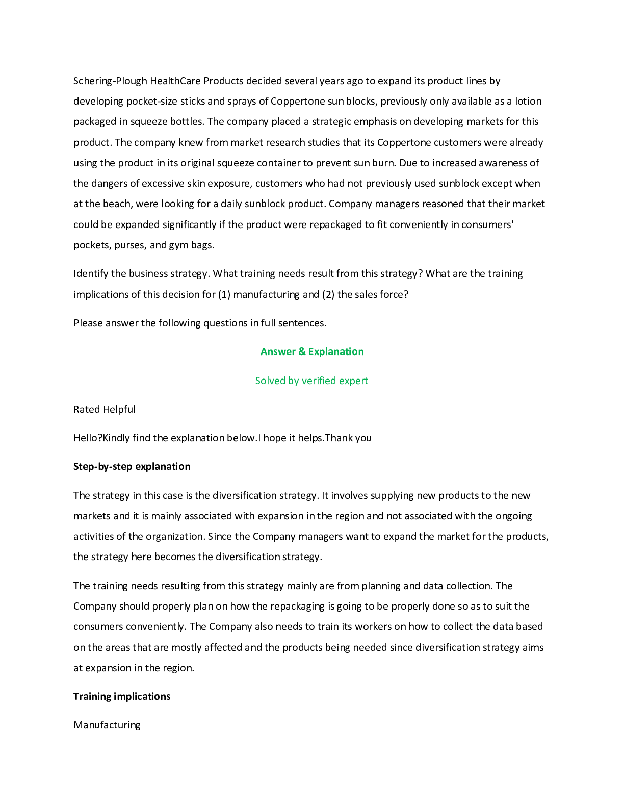 Management > QUESTIONS & ANSWERS > Schering-Plough HealthCare Products decided several years ago to expand its product lines by developing pocket-size sticks and sprays of Coppertone sun blocks, previously only available as a lotion packaged in squeeze bottles. (All)