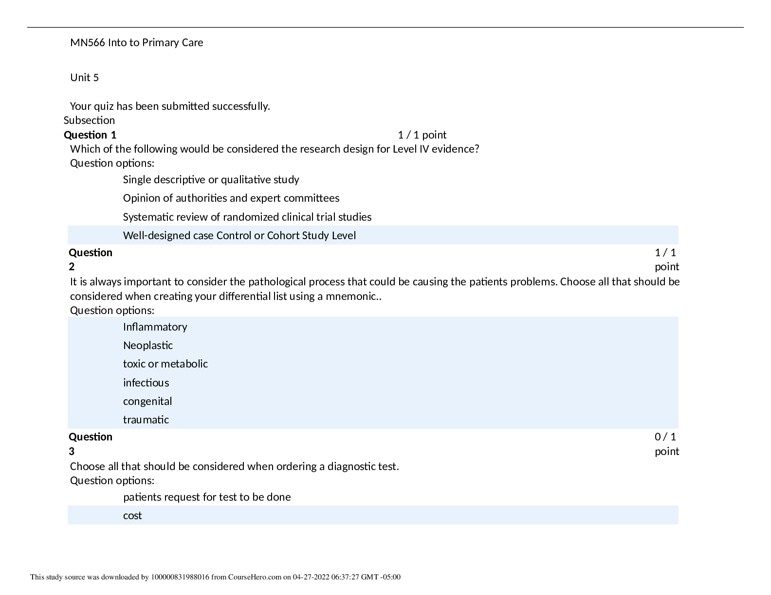 Management > QUESTIONS & ANSWERS > GRADE A MN 566 Midterm Exam Unit 5 – MN566 Into to Primary Care (All)
