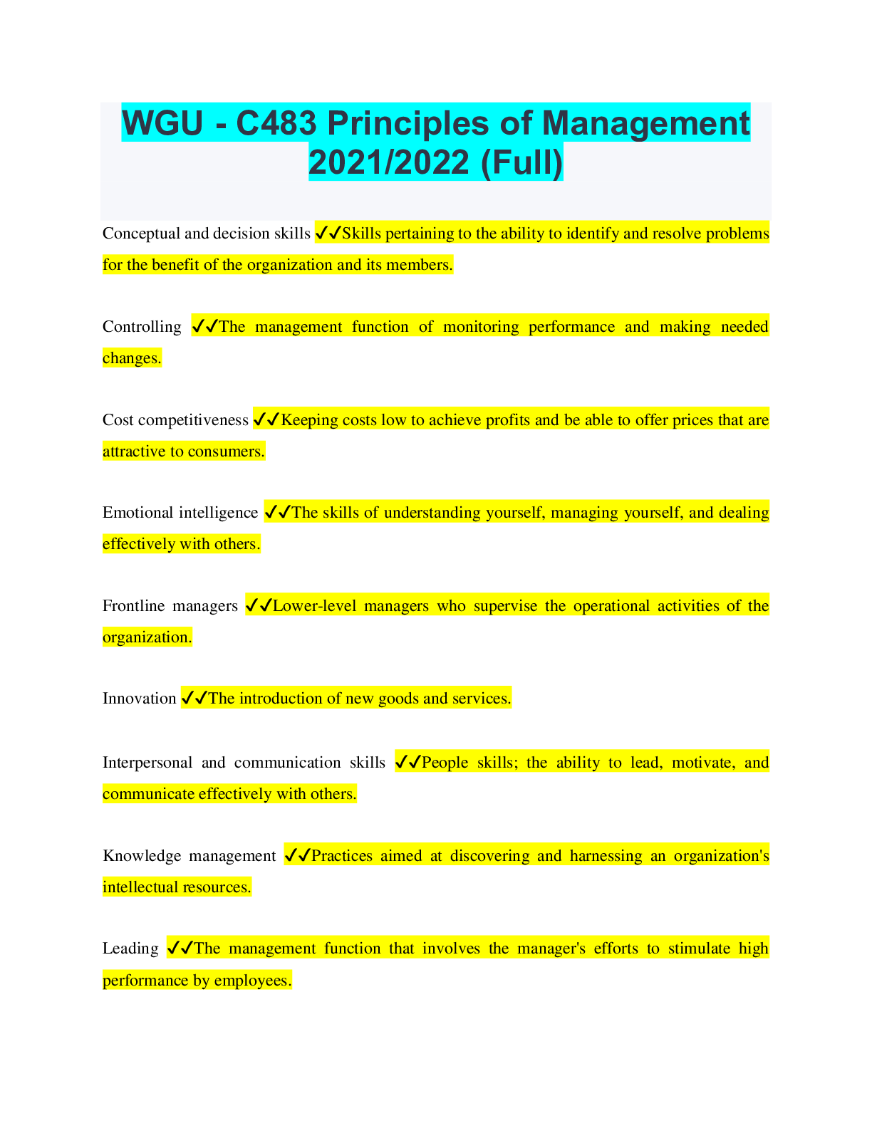 Management > QUESTIONS & ANSWERS > WGU - C483 Principles of Management 2021/2022 (Full) (All)