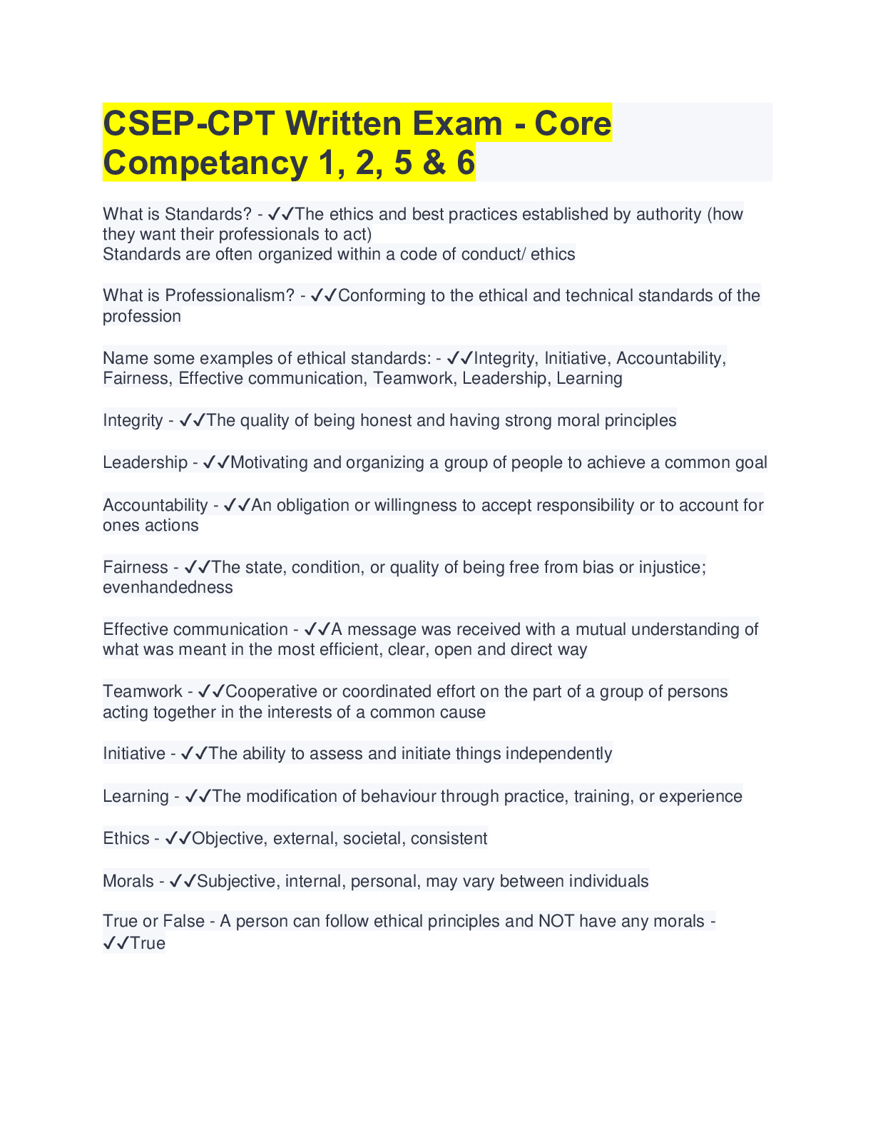 Management > QUESTIONS & ANSWERS > CSEP-CPT Written Exam - Core Competancy 1, 2, 5 & 6( COMPLETE QUESTIONS & 100% answers correct) (All)
