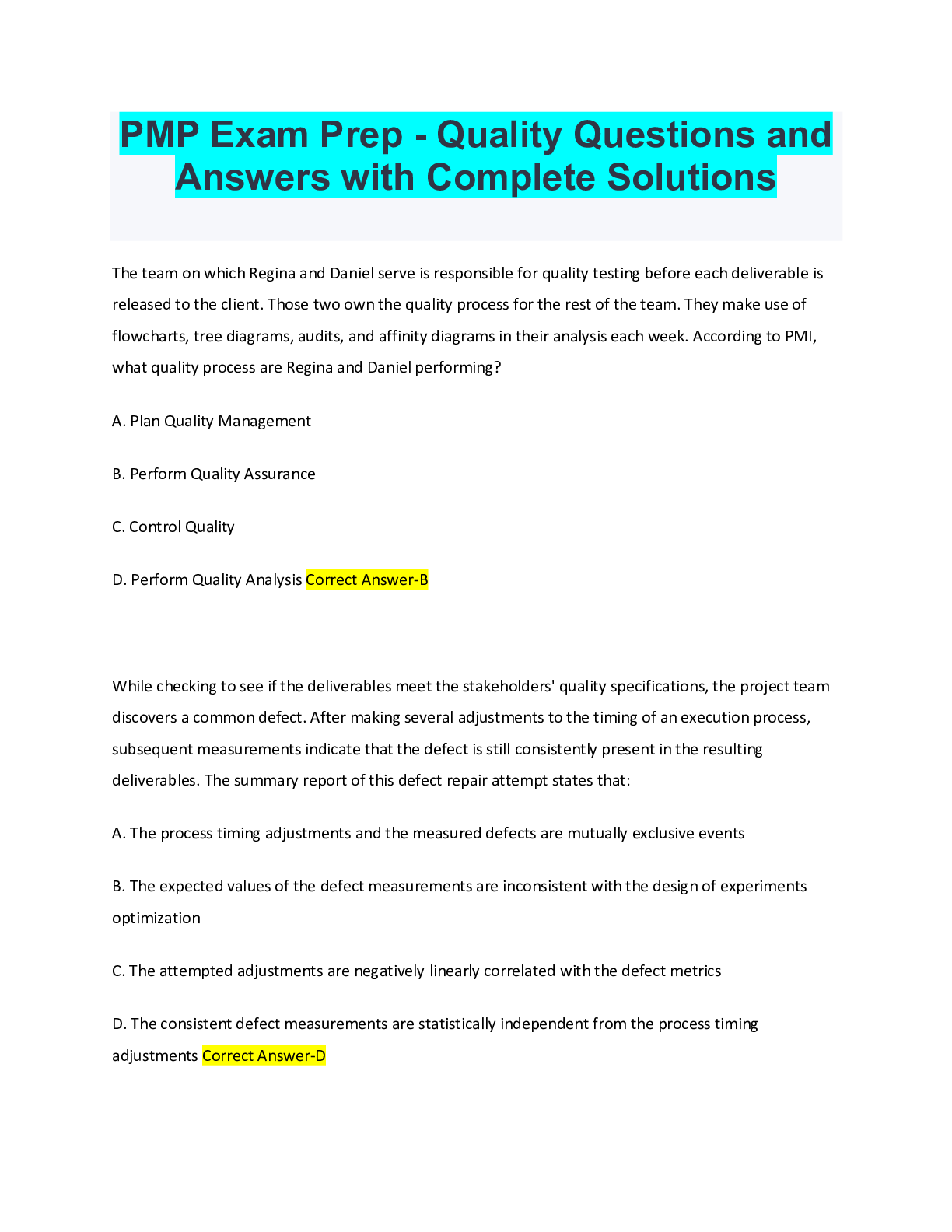 Management > EXAM > PMP Exam Prep - Quality Questions and Answers with Complete Solutions (All)