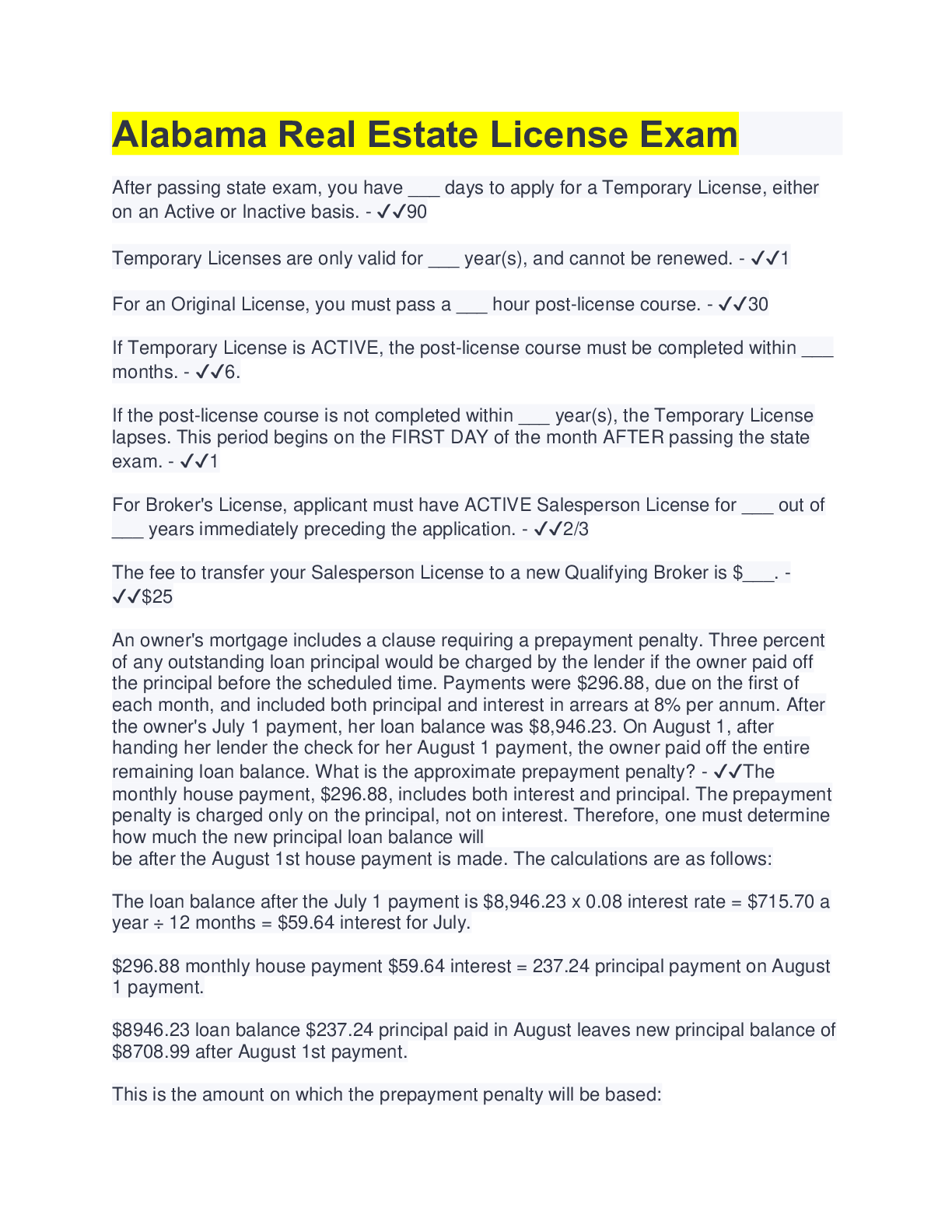 Management > QUESTIONS & ANSWERS > Alabama Real Estate License Exam 2022 ( questions & 100% verified correct answers) (All)