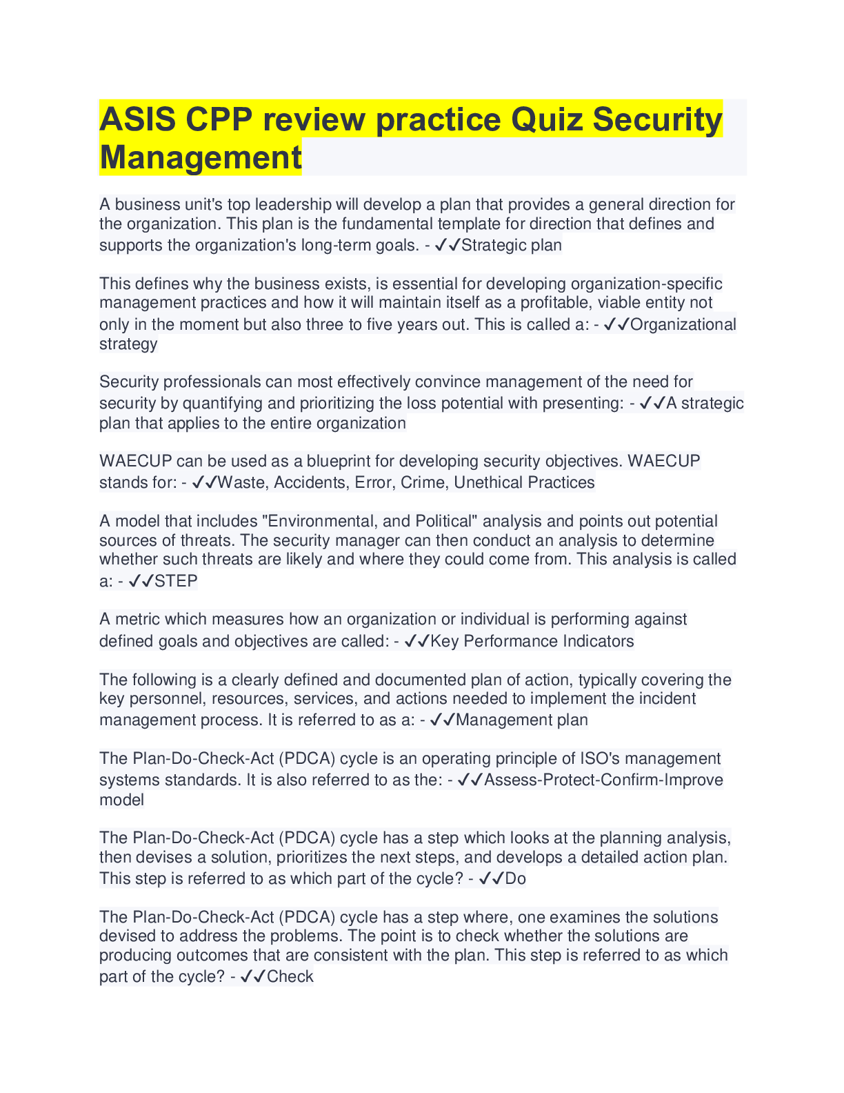 Management > QUESTIONS & ANSWERS > ASIS CPP review practice Quiz Security Management2022 ( with 100% verified correct answers) (All)