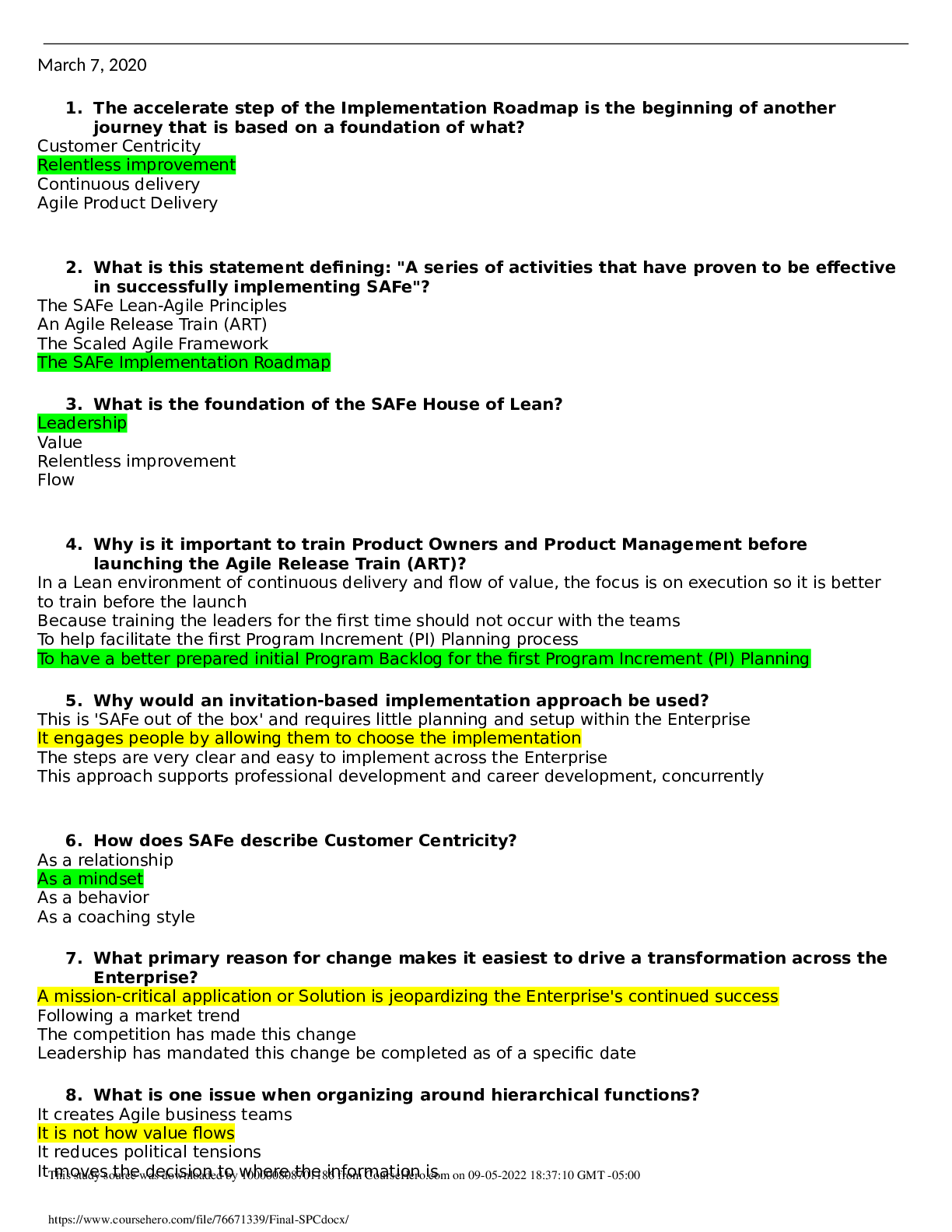 Management > QUESTIONS & ANSWERS > Scaled Agile Framework (SAFe) Program Consultant (SPC) Final Quiz March 2020 (All)