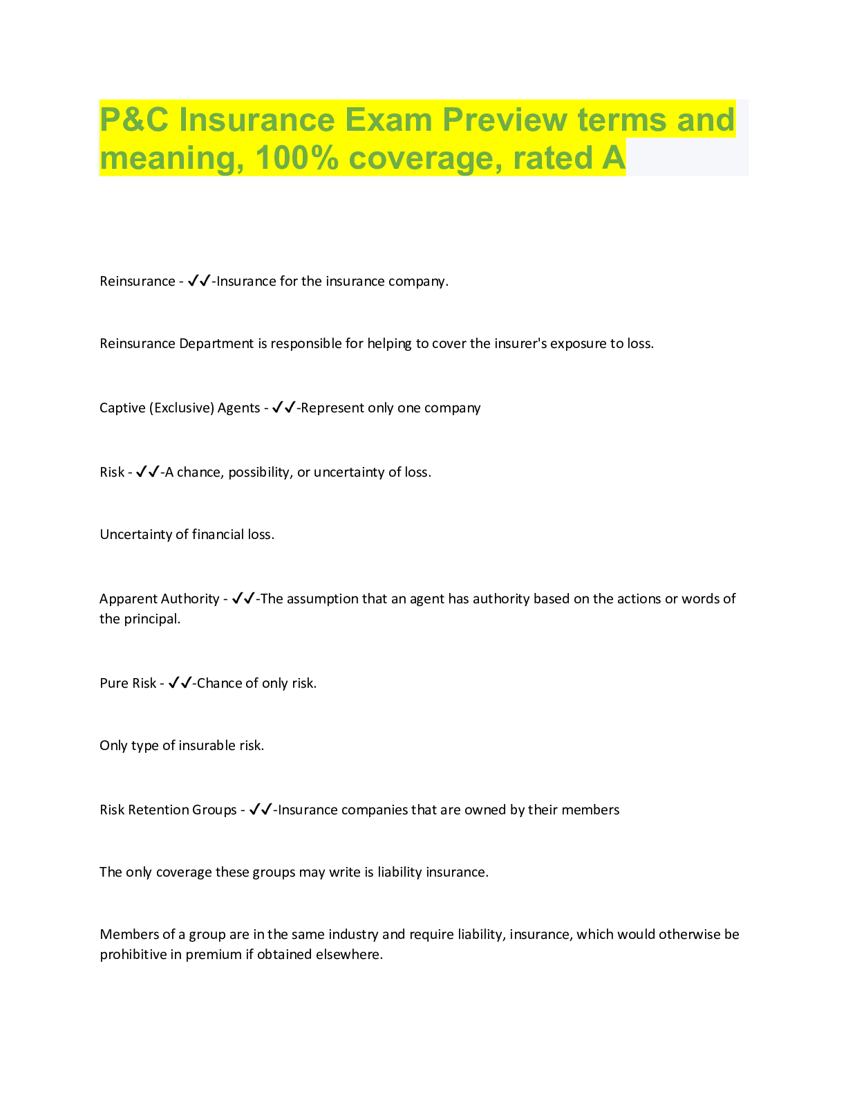 Management > QUESTIONS & ANSWERS > P&C Insurance Exam Preview terms and meaning, 100% coverage, rated A (All)