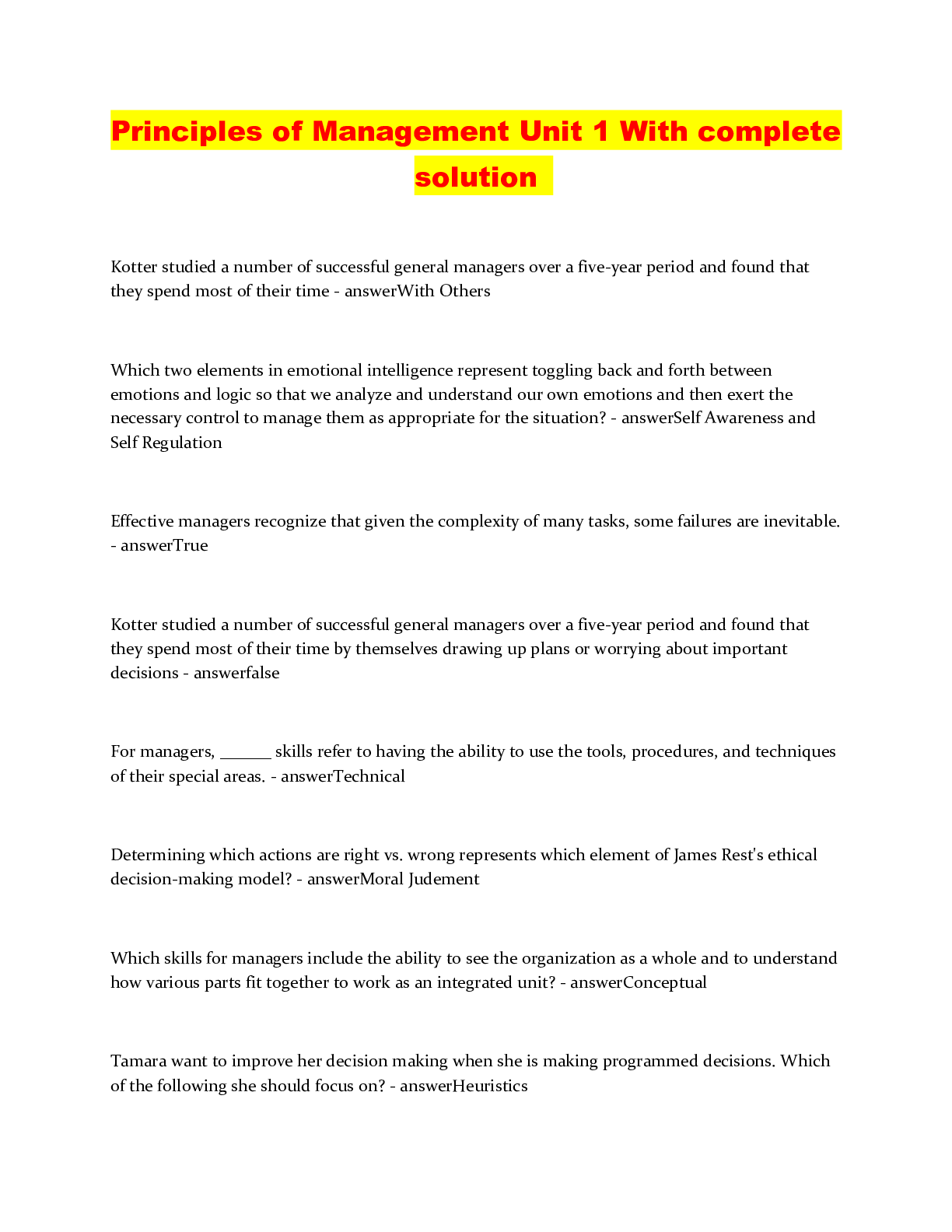 Management > QUESTIONS & ANSWERS > Principles of Management Unit 1 With complete solution (All)