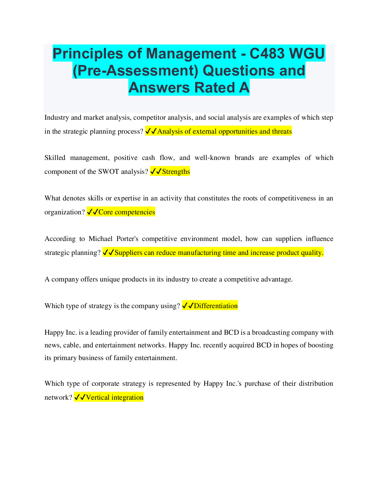 Management > QUESTIONS & ANSWERS > Principles of Management - C483 WGU (Pre-Assessment) Questions and Answers Rated A (All)
