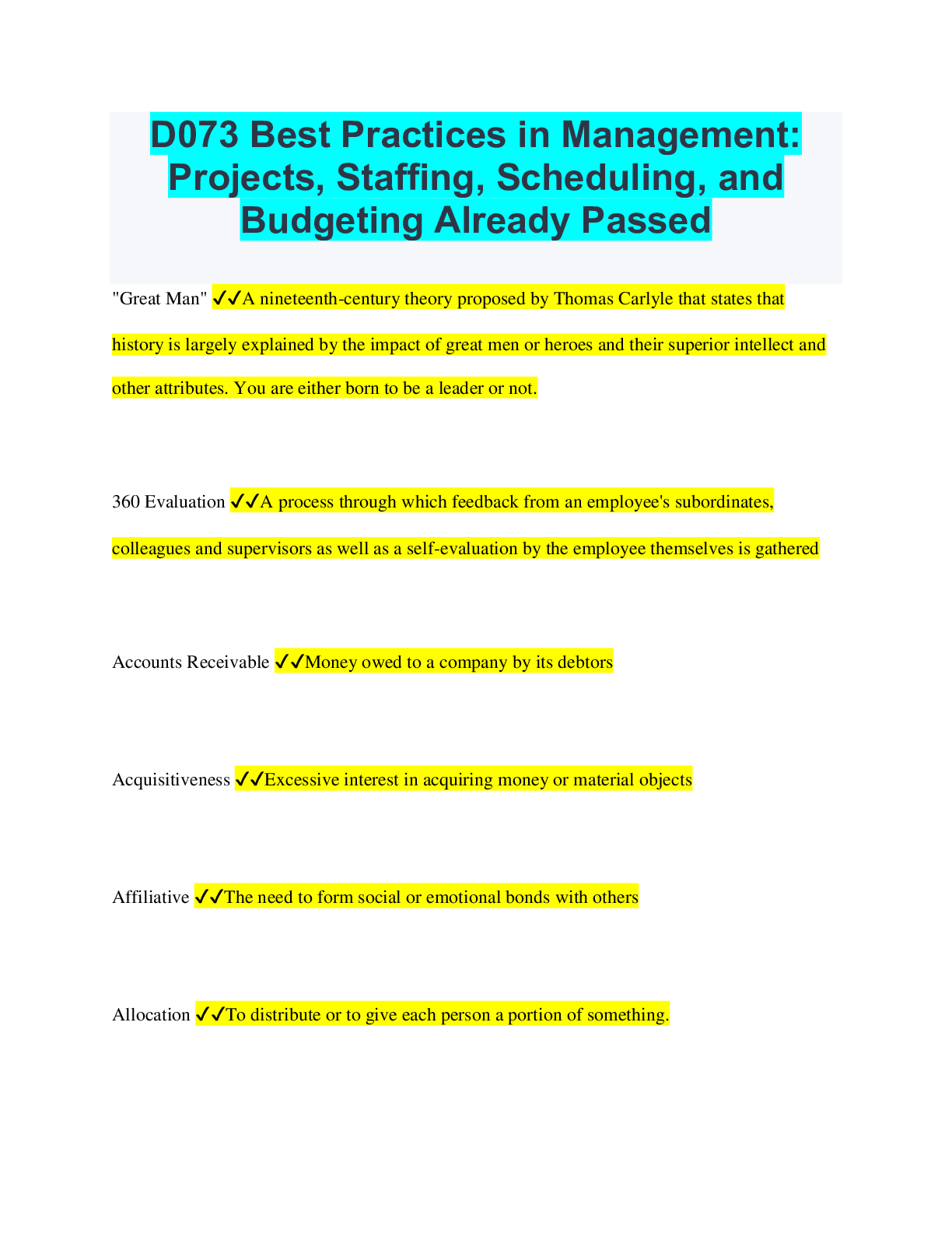 Management > QUESTIONS & ANSWERS > D073 Best Practices in Management: Projects, Staffing, Scheduling, and Budgeting Already Passed (All)