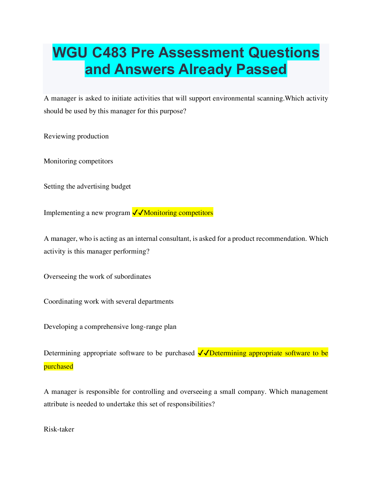 Management > QUESTIONS & ANSWERS > WGU C483 Pre Assessment Questions and Answers Already Passed (All)