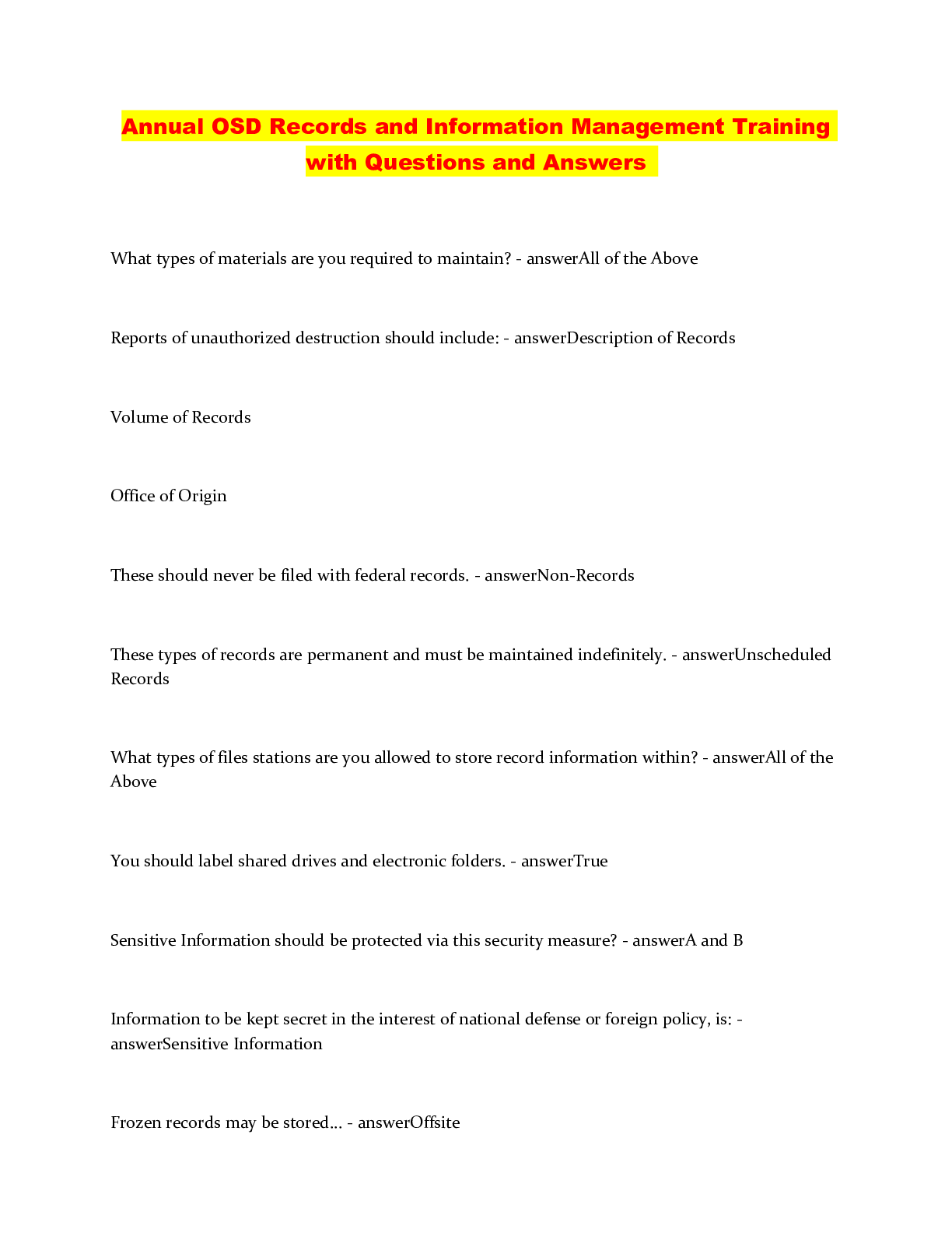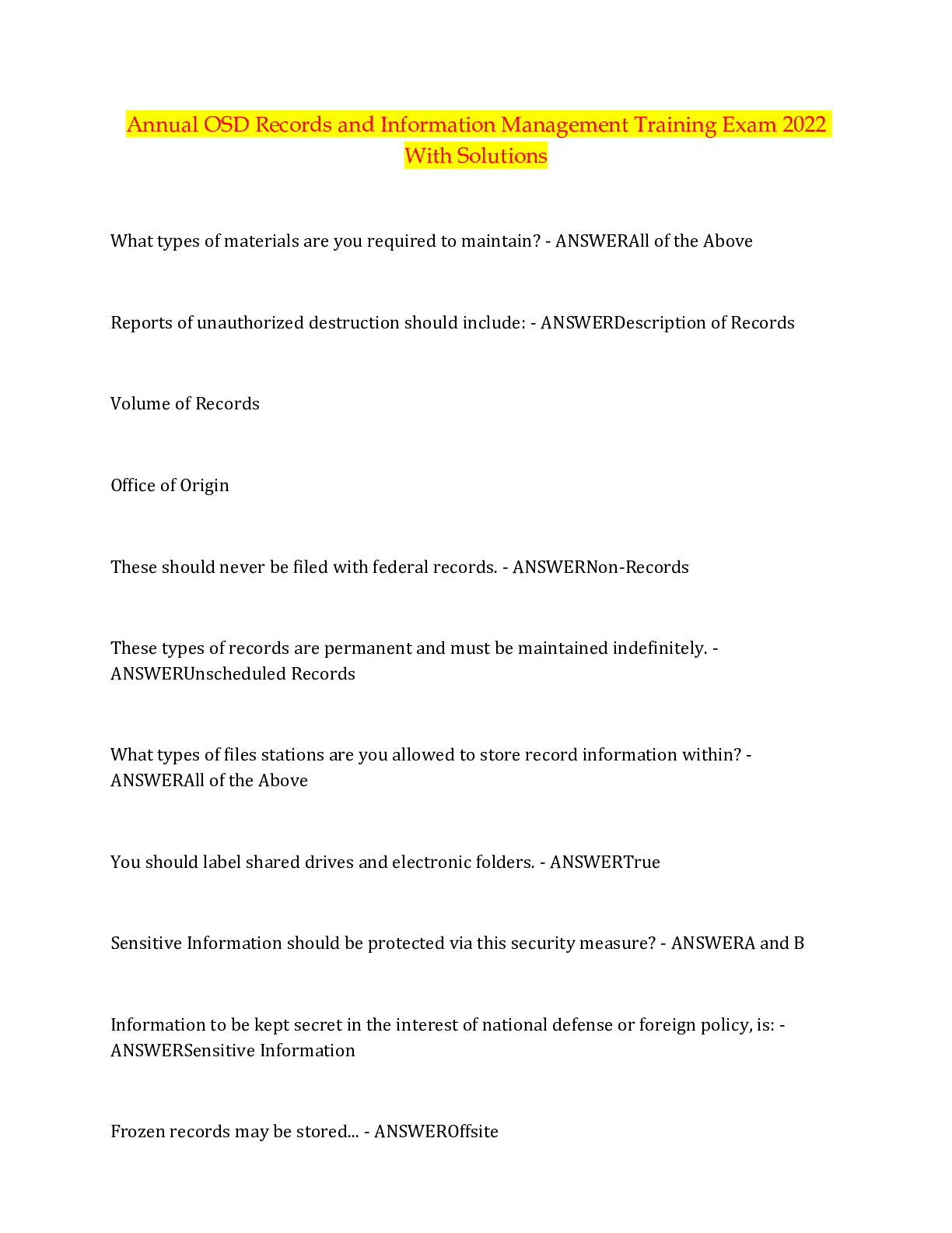 Management > QUESTIONS & ANSWERS > Annual OSD Records and Information Management Training with Questions and Answers (All)