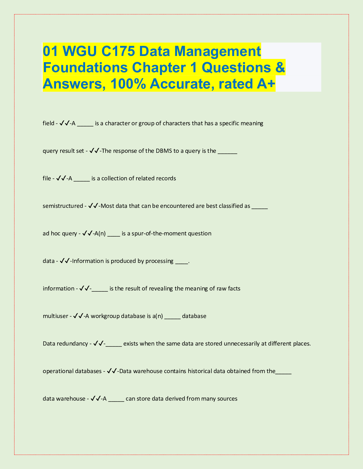 Management > QUESTIONS & ANSWERS > 01 WGU C175 Data Management Foundations Chapter 1 Questions & Answers, 100% Accurate, rated A+ (All)