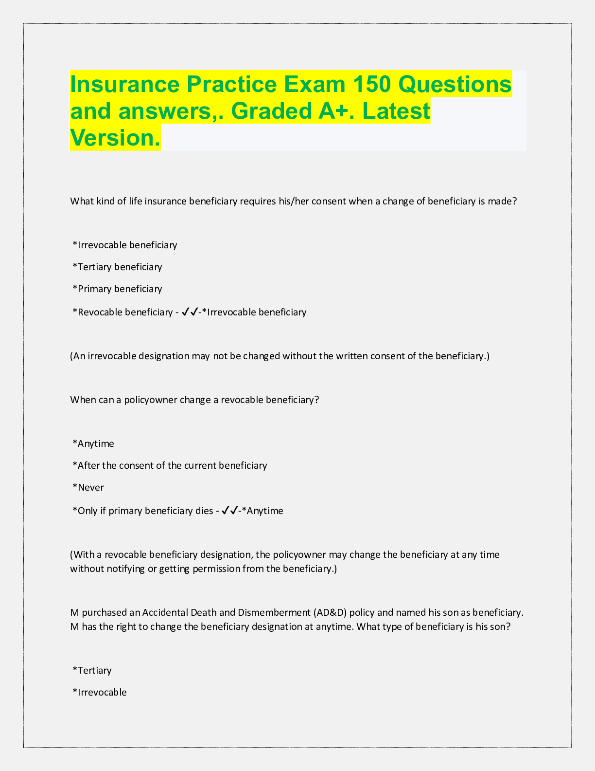 Management > QUESTIONS & ANSWERS > Pearson Vue Life Insurance Practice Exam Questions with accurate answers, 100% Accurate, rated A+ (All)