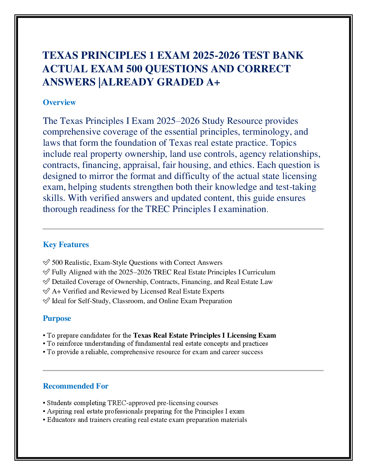 Real Estate > EXAM > TEXAS PRINCIPLES 1 EXAM 2025-2026 TEST BANK ACTUAL EXAM 500 QUESTIONS AND CORRECT ANSWERS |ALREADY GRADED A+ (All)