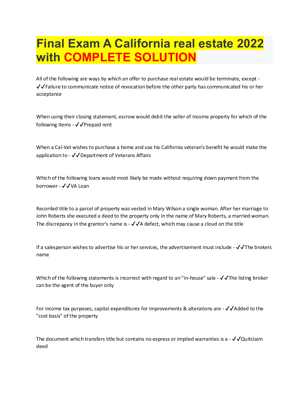 Real Estate > EXAM > Final Exam A California real estate 2022 with COMPLETE SOLUTION (All)
