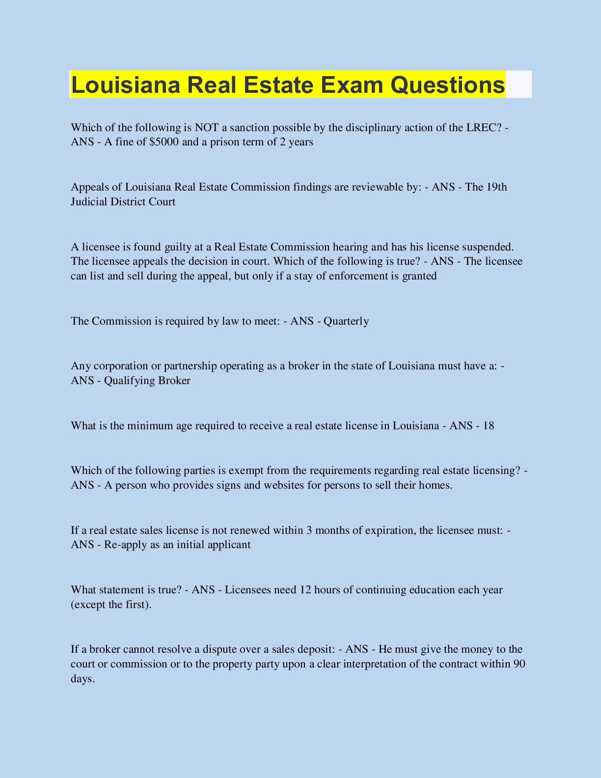 Real Estate > QUESTIONS & ANSWERS > Louisiana Real Estate Exam Questions (All)