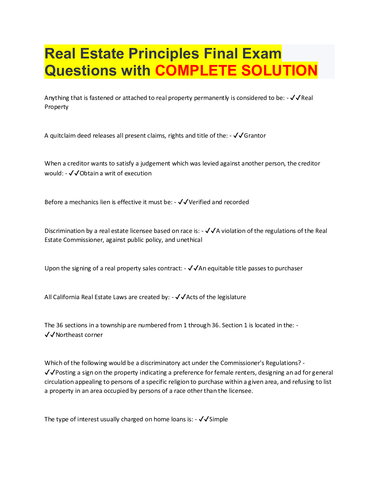 Real Estate > EXAM > Real Estate Principles Final Exam Questions with COMPLETE SOLUTION (All)