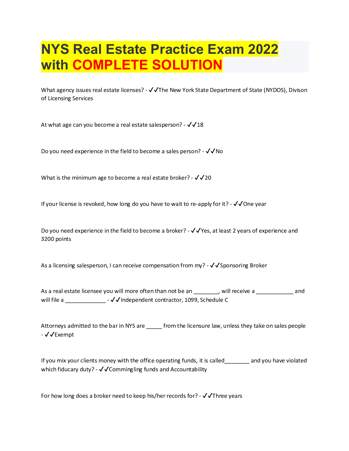 Real Estate > QUESTIONS & ANSWERS > NYS Real Estate Practice Exam 2022 with COMPLETE SOLUTION (All)