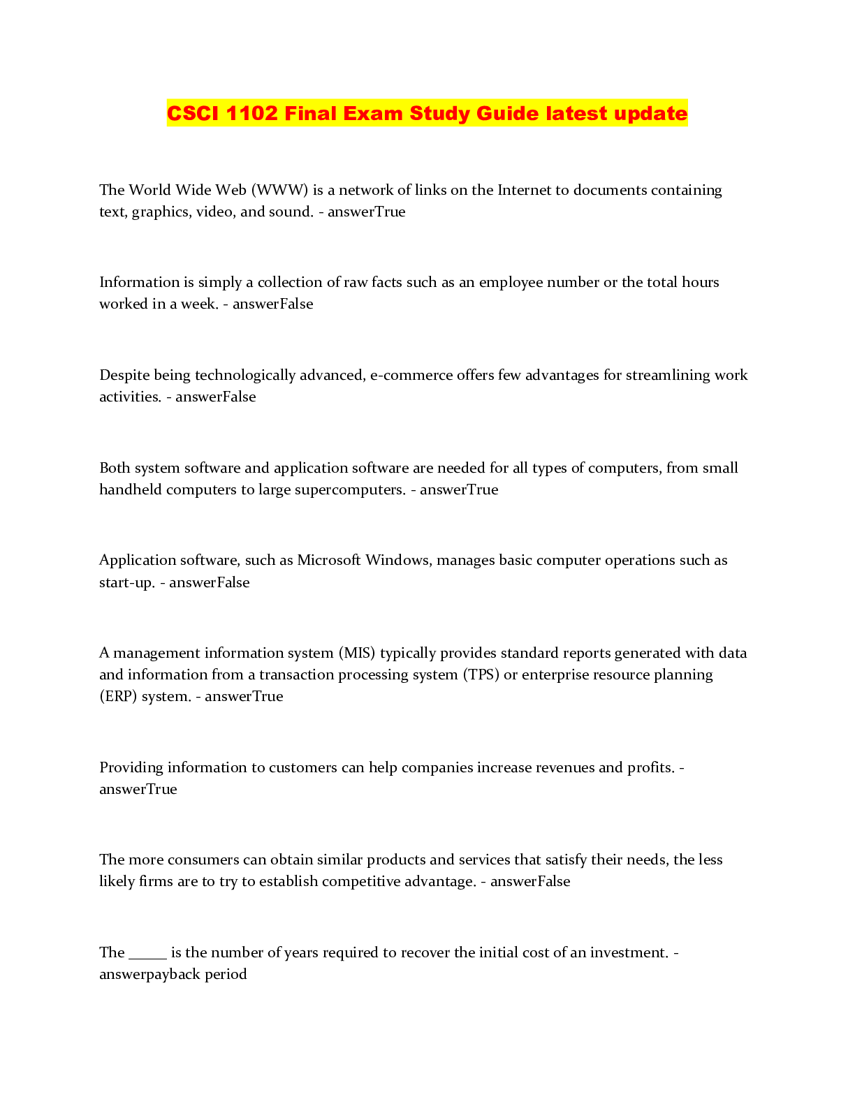 Computer Networking > QUESTIONS & ANSWERS > CSCI 1102 Final Exam Study Guide latest update (All)
