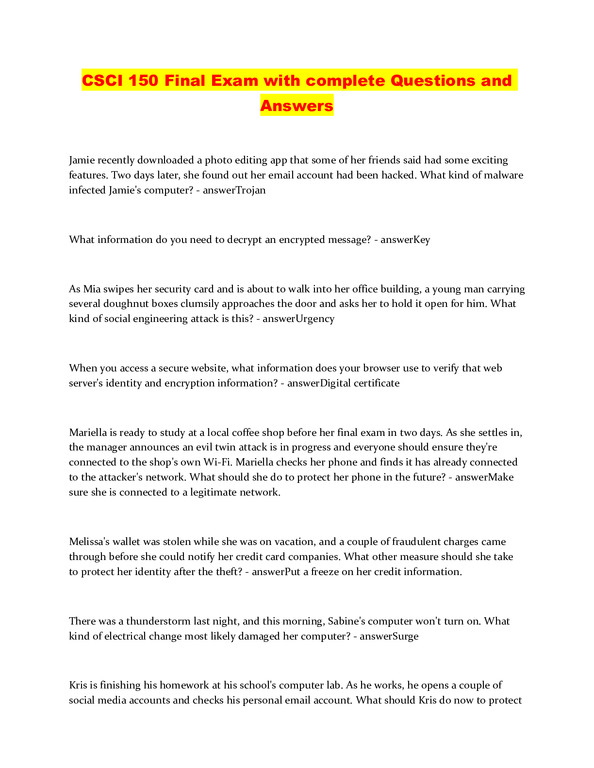 Computer Networking > QUESTIONS & ANSWERS > CSCI 150 Final Exam with complete Questions and Answers (All)
