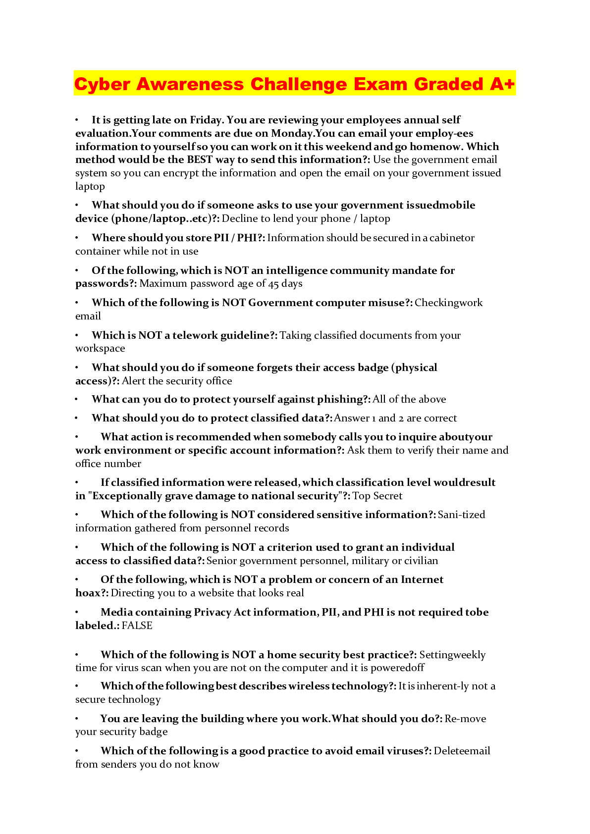Computer Networking > QUESTIONS & ANSWERS > Cyber Awareness Challenge Exam Graded A+ (All)