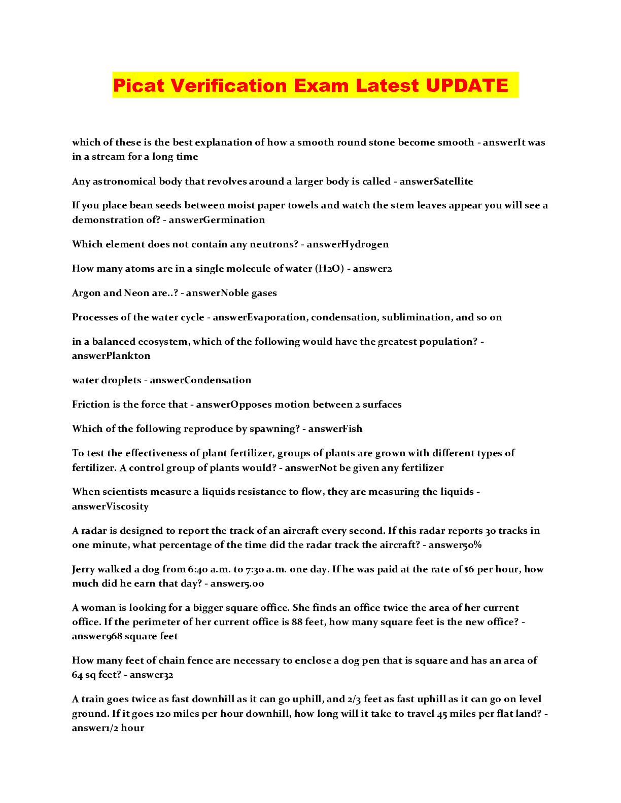 Computer Networking > QUESTIONS & ANSWERS > Picat Verification Exam Latest UPDATE (All)