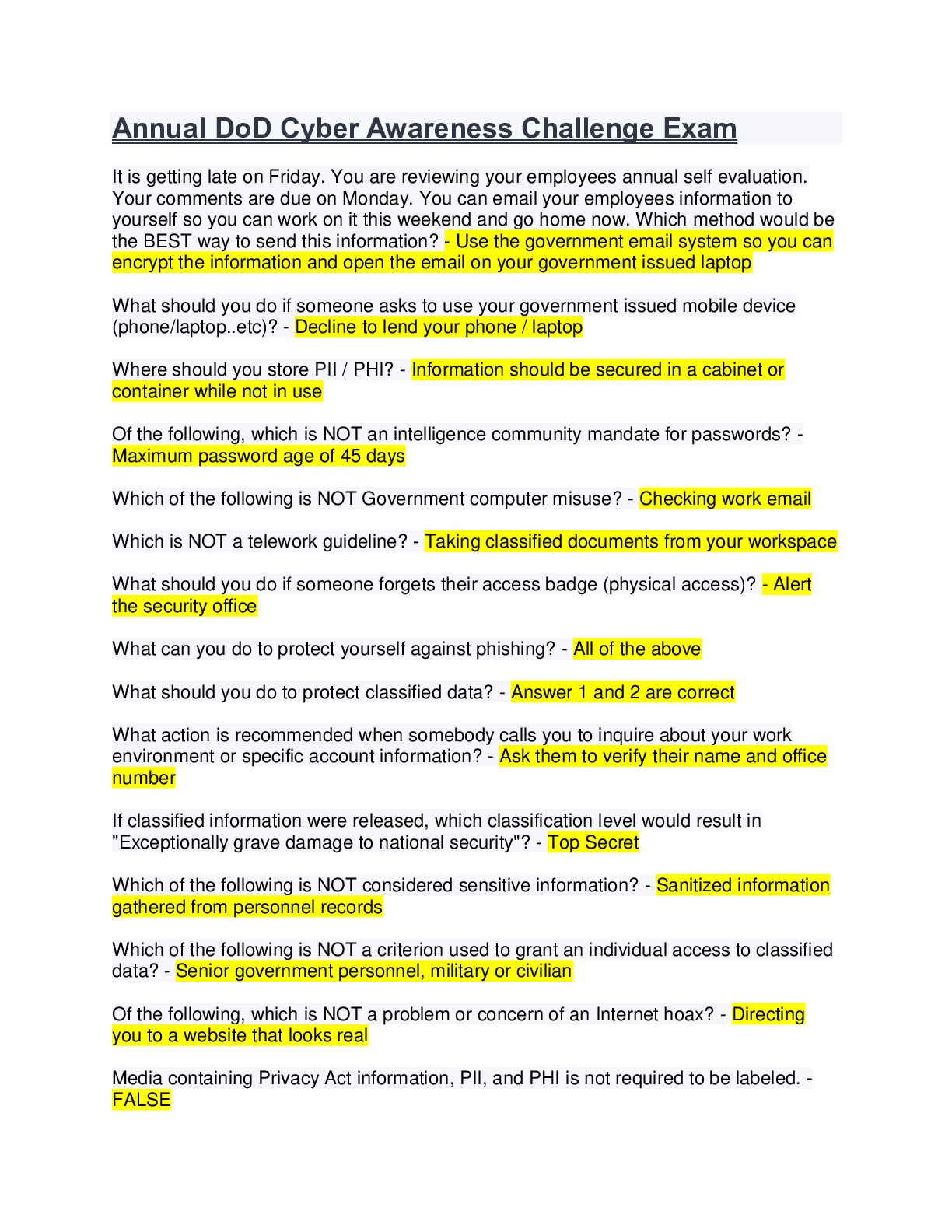 Computer Networking > EXAM > Annual DoD Cyber Awareness Challenge Exam answered latest fall 2022. (All)