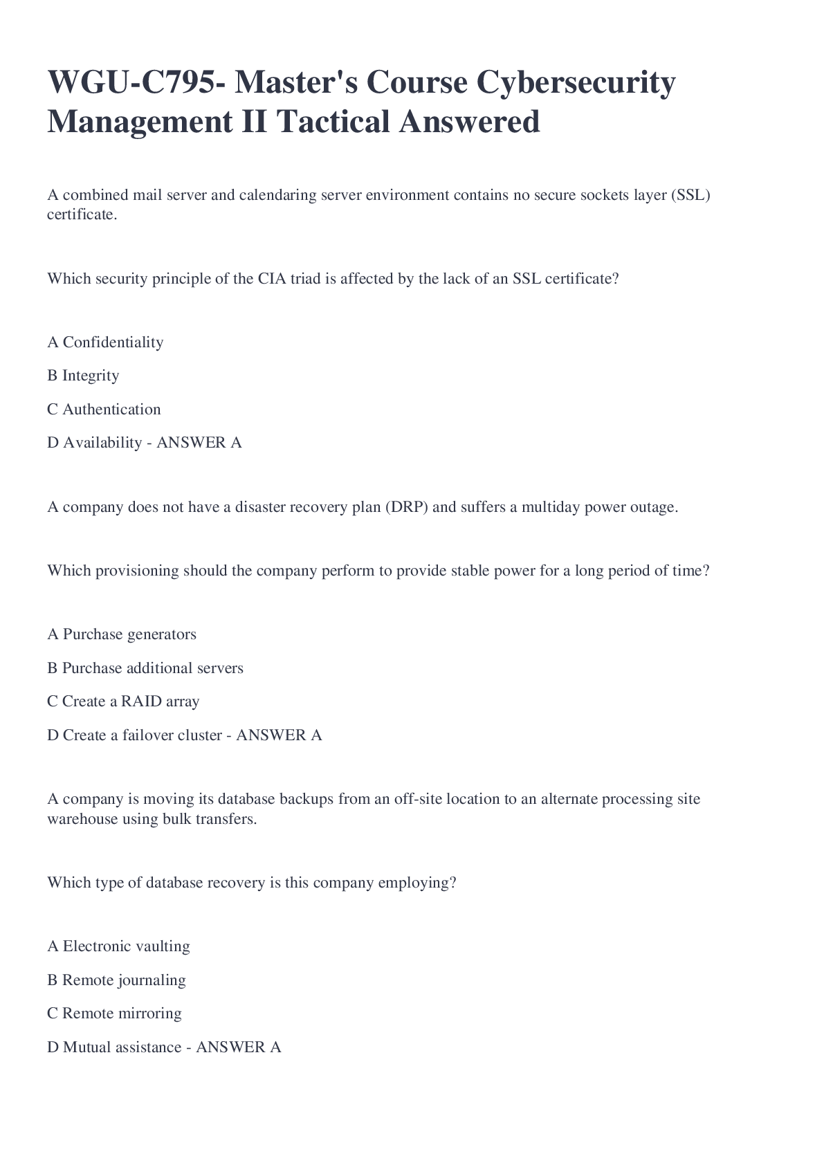 Computer Networking > EXAM > WGU-C795- Master's Course Cybersecurity Management II Tactical Answered (All)