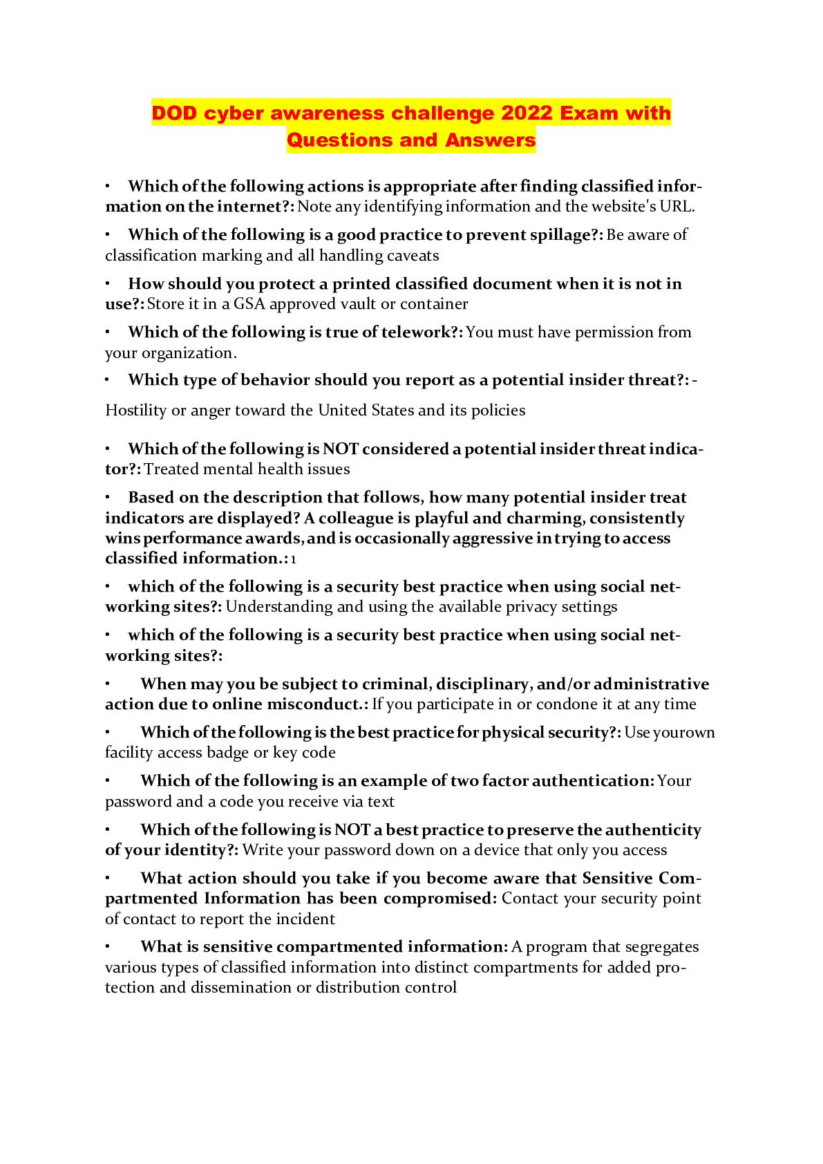 Computer Networking > QUESTIONS & ANSWERS > DOD cyber awareness challenge 2022 Exam with Questions and Answers (All)