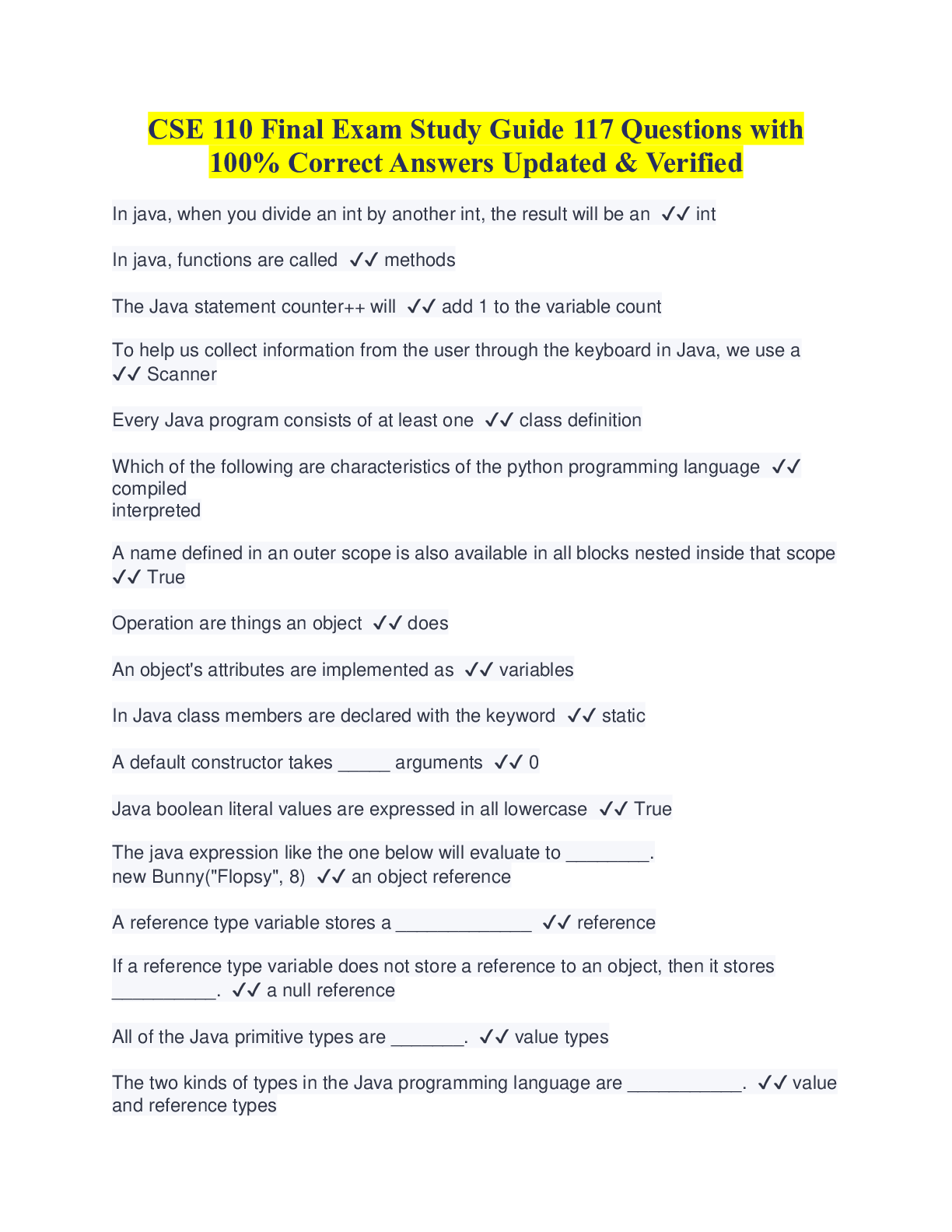 Programming > QUESTIONS & ANSWERS > CSE 110 Final Exam Questions with 100% Correct Answers Updated & Verified (All)