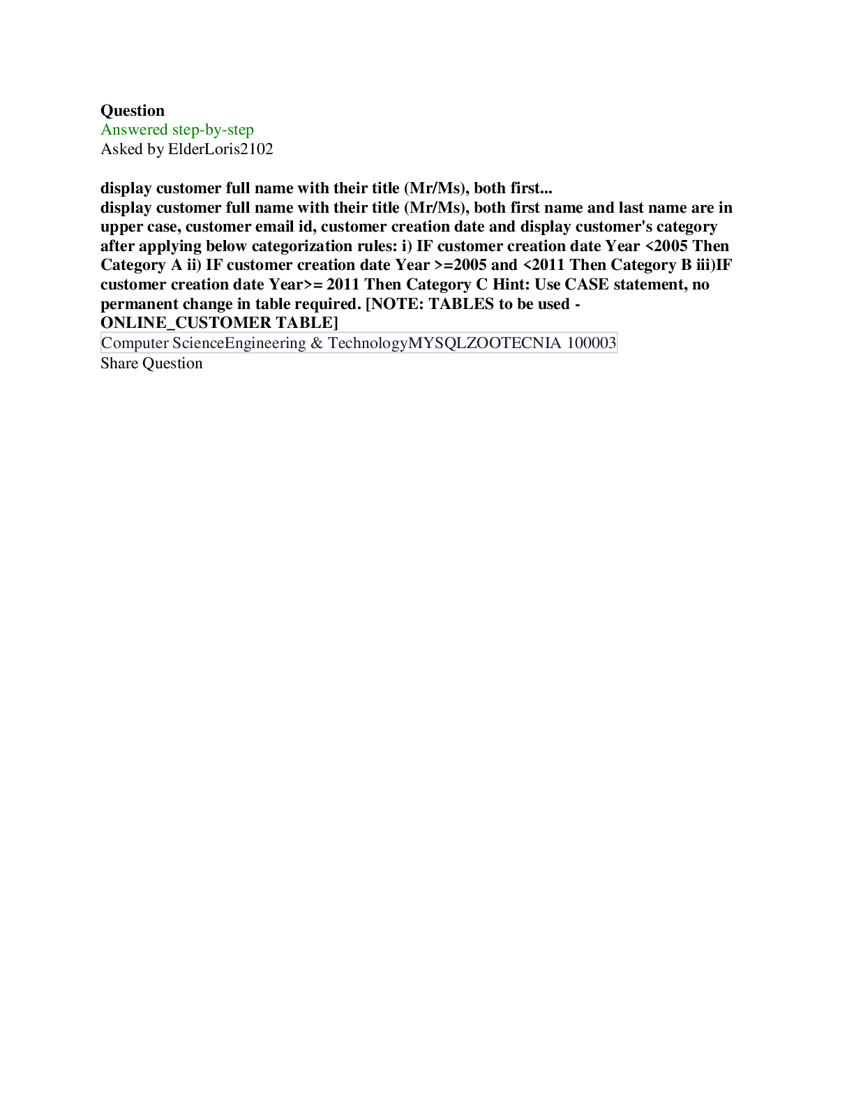 Programming > QUESTIONS & ANSWERS > Questions and Answers > Computer Science Engineering & Technology. National Open and Distance University. Display customer full name with their title (Mr/Ms), both first name and last name are in upper case, customer email id, customer creation date and display customer's category after applying below categorization rules: i) IF customer creation date Year <2005 Then Category A ii) IF customer creation date Year >=2005 and <2011 Then Category B iii)IF customer creation date Year>= 2011 Then Category C Hint: Use CASE statement, no permanent change in table required. (All)