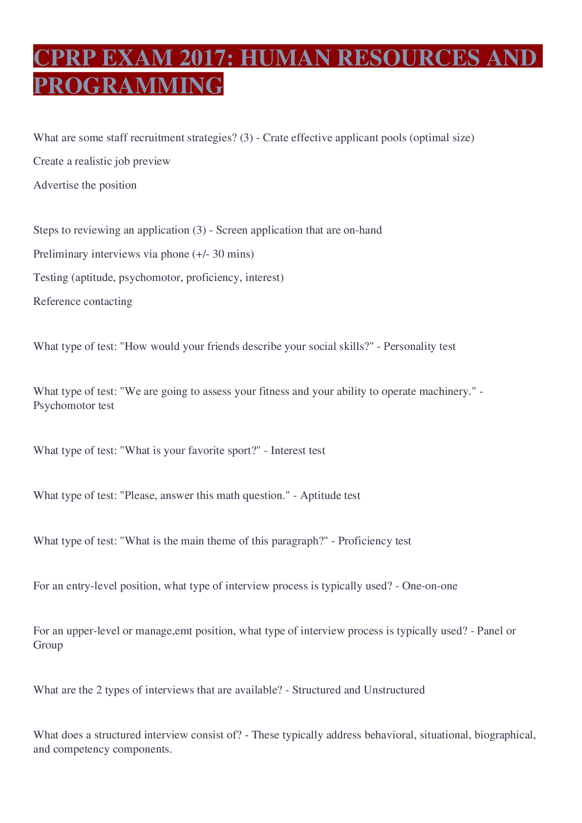 Programming > EXAM > CPRP EXAM 2017: HUMAN RESOURCES AND PROGRAMMING QUESTIONS AND ANSWERS LATEST UPDATED 2022/2023 (All)